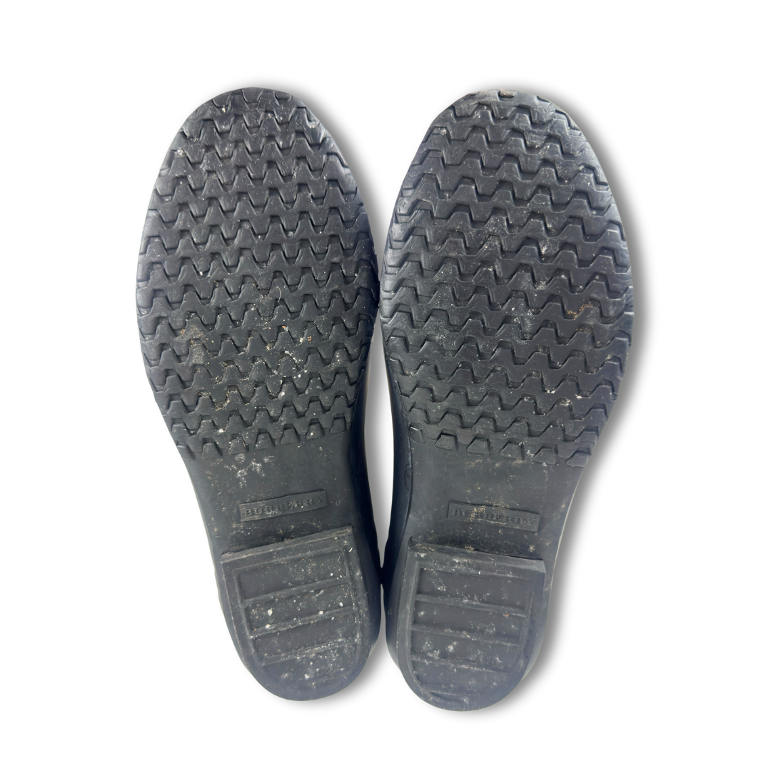 Black rubber upper with Burberry Vintage Check paneling, rubber sole, and silver-tone logo plate. Includes certificate of authenticity.