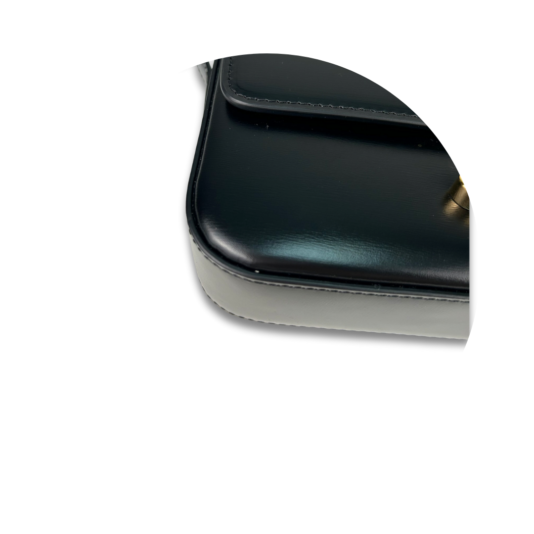 Smooth black calfskin exterior with black lambskin interior and gold-tone hardware. Features Celine Triomphe clasp closure, adjustable shoulder strap, and interior flat pocket. Includes certificate of authenticity and original dust bag.