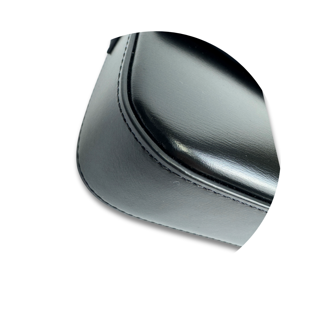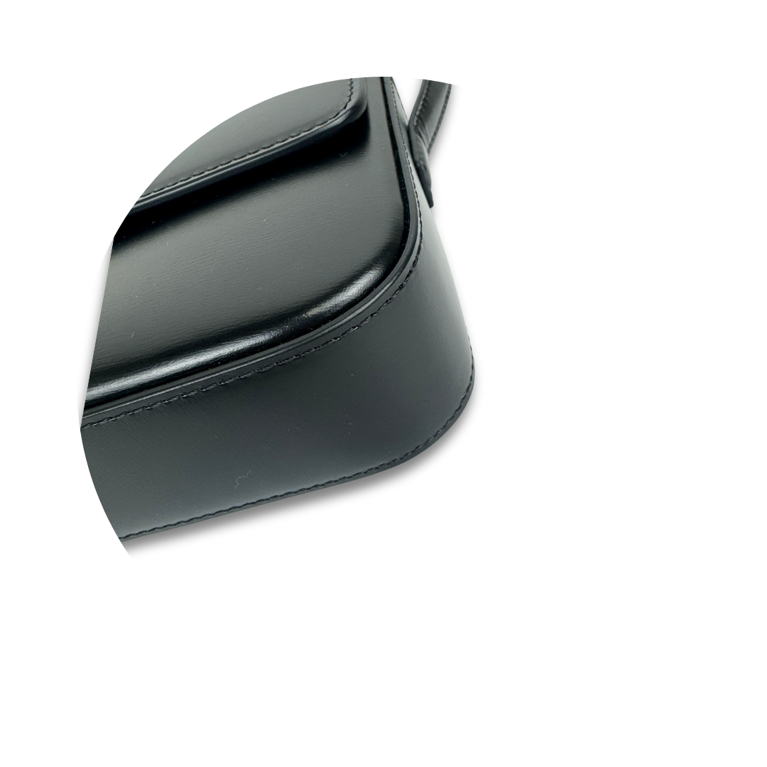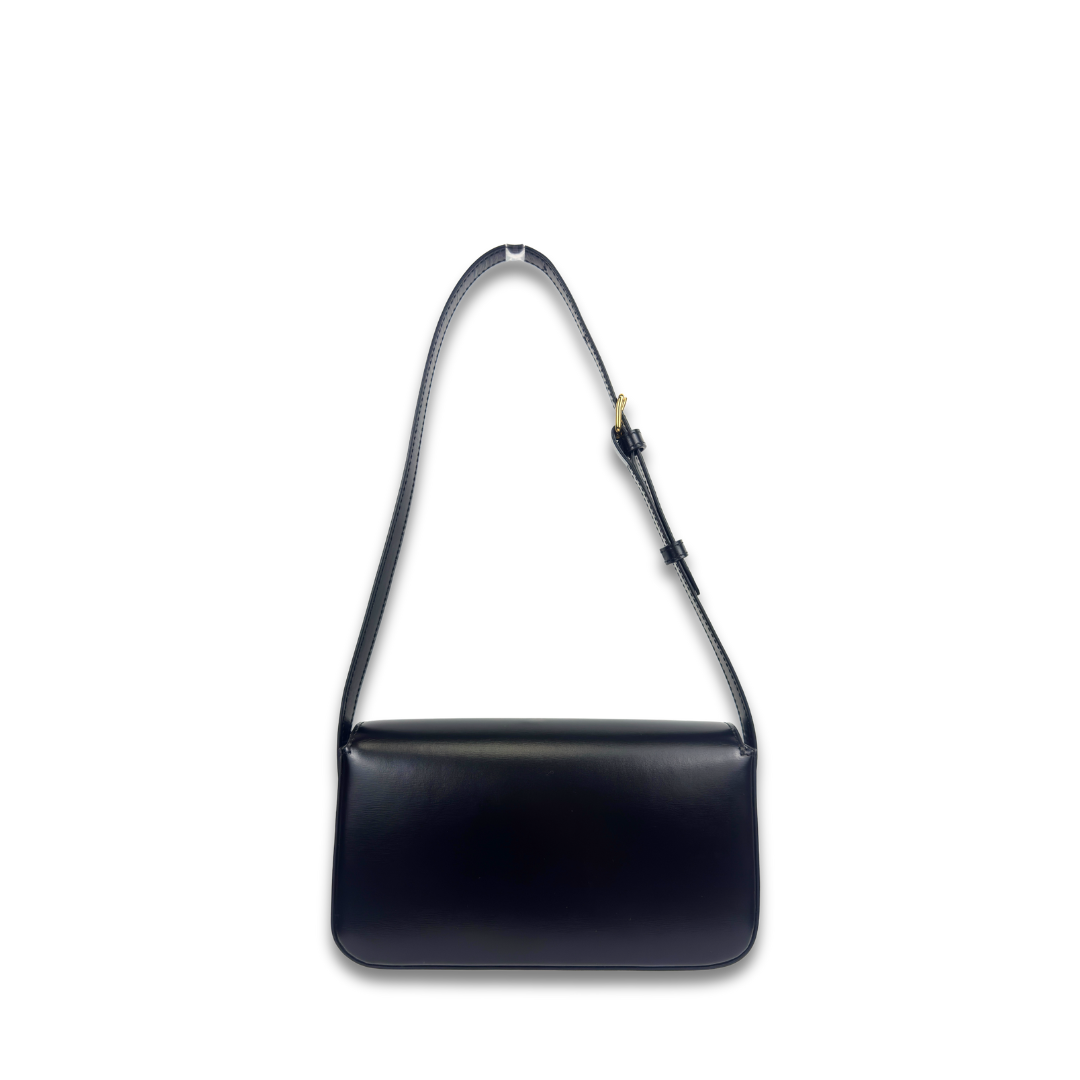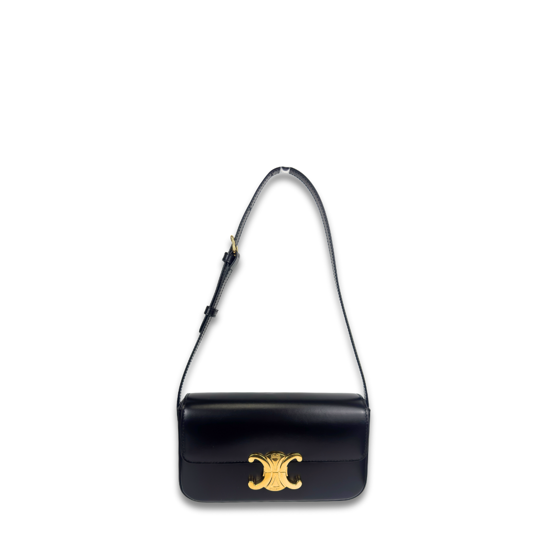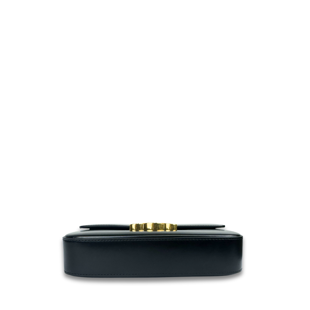 Smooth black calfskin exterior with black lambskin interior and gold-tone hardware. Features Celine Triomphe clasp closure, adjustable shoulder strap, and interior flat pocket. Includes certificate of authenticity and original dust bag.