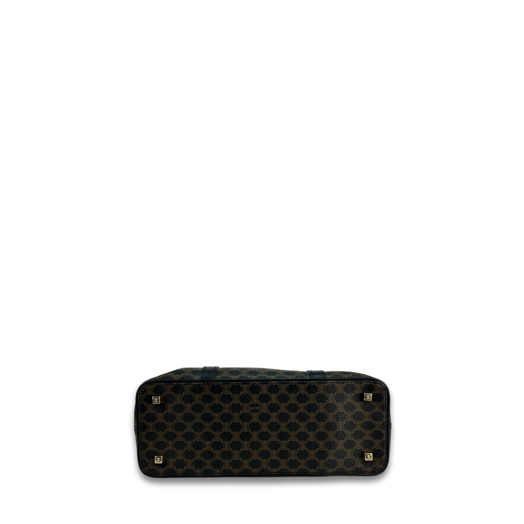 Celine Macadam coated canvas with black leather trim, black canvas interior, and gold-tone hardware. Features dual leather top handles, open top, interior flat pocket, and two interior compartments separated by a central interior zipper pocket. Includes certificate of authenticity.