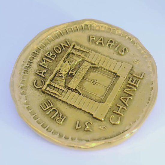 Textured gold-tone pin featuring 'Rue Cambon' street sign motif. Includes a certificate of authenticity and dust bag.