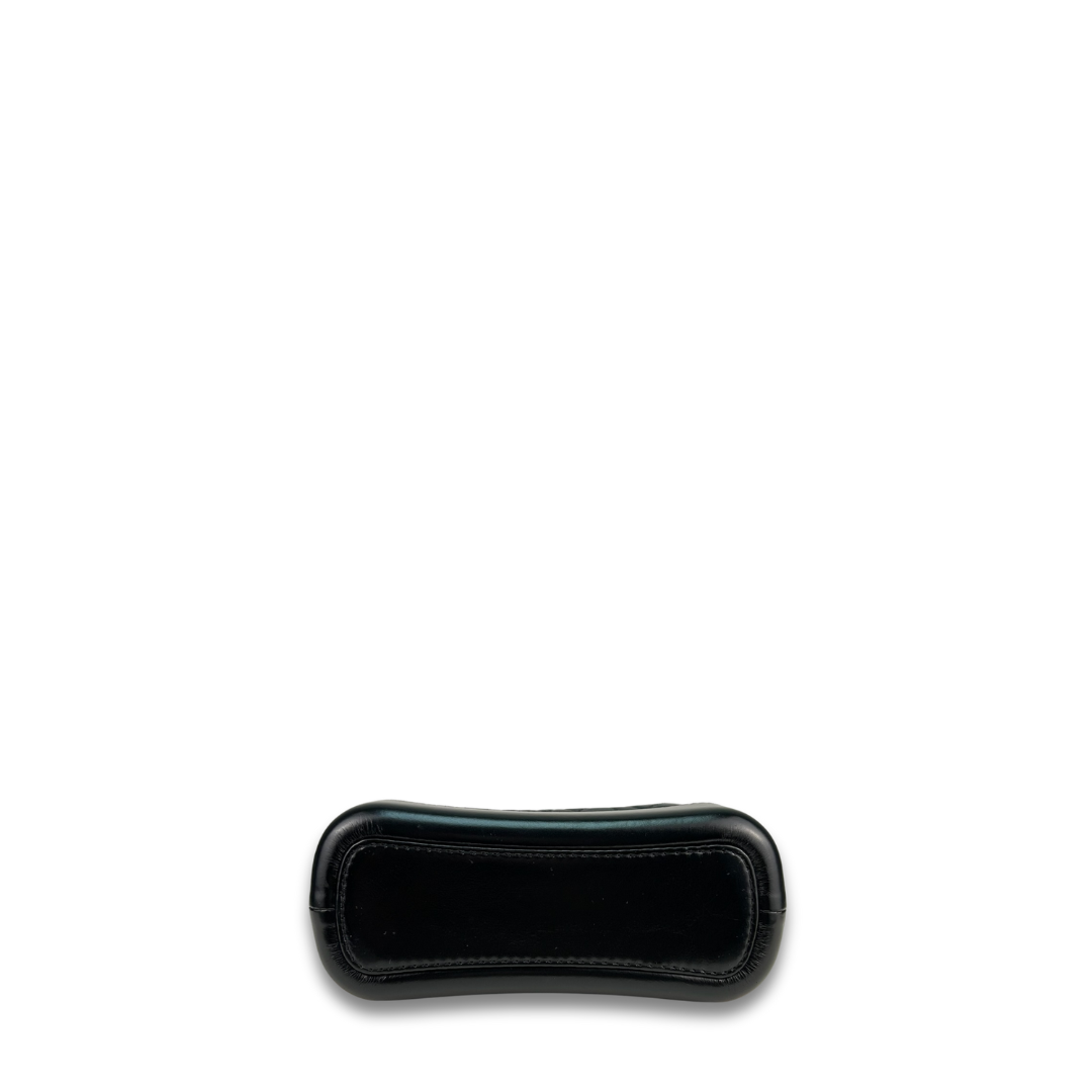 Black crinkle calfskin exterior with smooth black lambskin trim, red grosgrain interior and mixed-tone hardware. Features logo zipper pull, leather-woven chain straps that can be worn as a shoulder bag or crossbody, several interior pockets, and interior key ring strap. Please note wear on leather-woven chain strap. Includes certificate of authenticity.