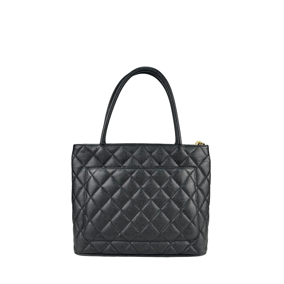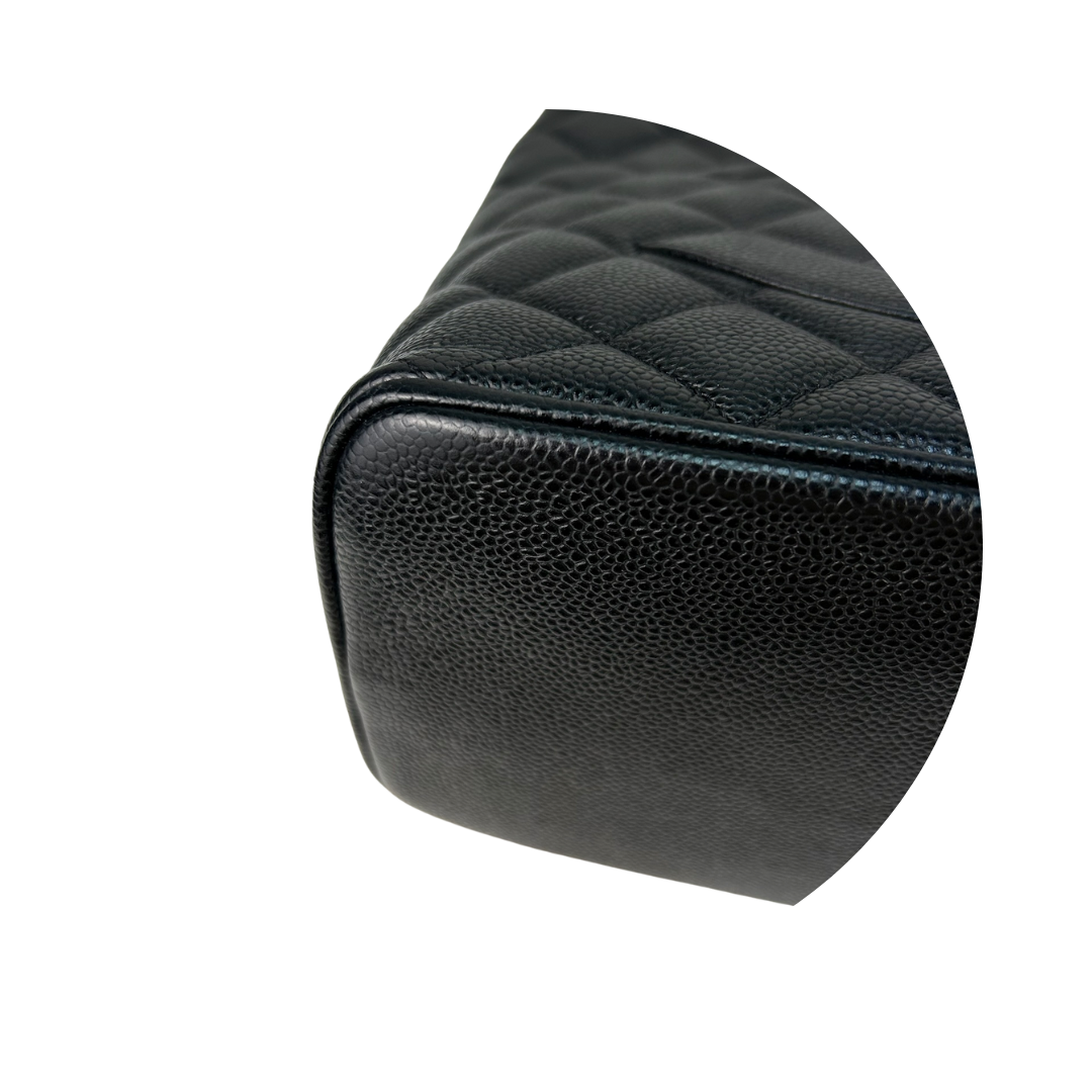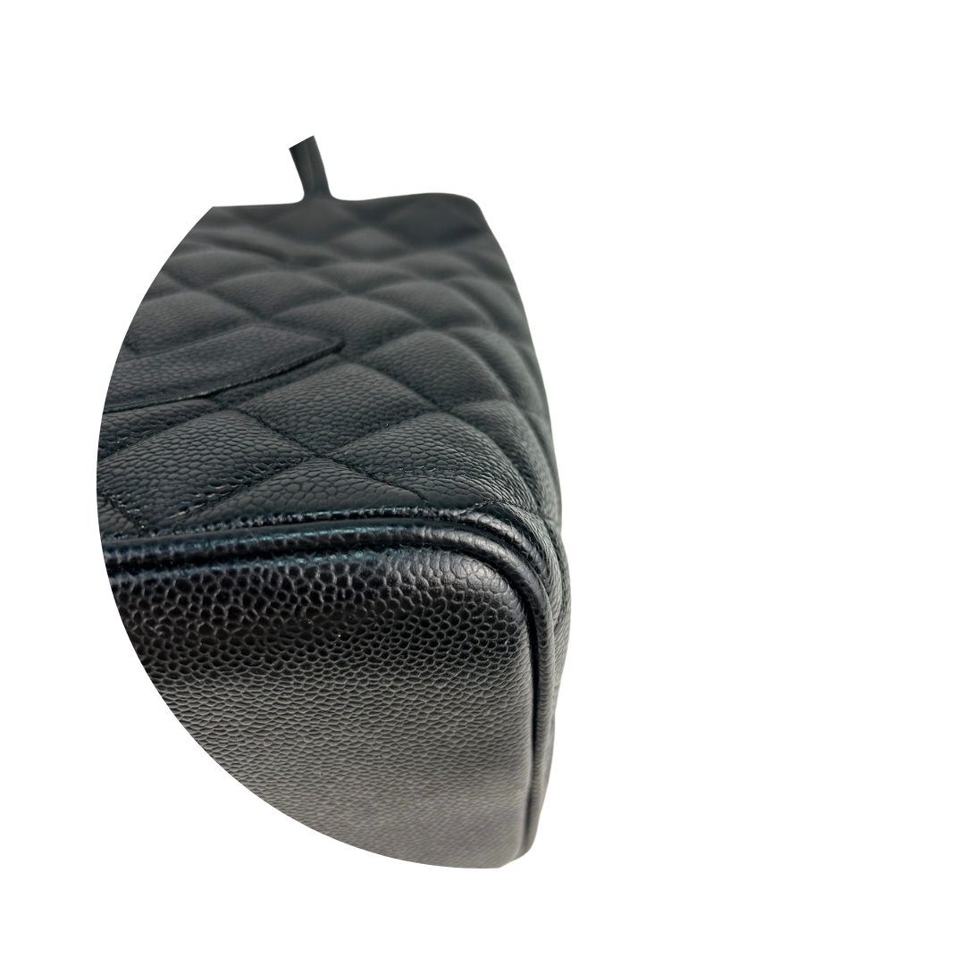 Black quilted caviar leather exterior with tonal leather interior and gold hardware. Features exterior patch pocket at back, two interior pockets, stitched and embossed CC logo at front, and zip closure with iconic logo medallion pull. Includes certificate of authenticity and original dust bag.