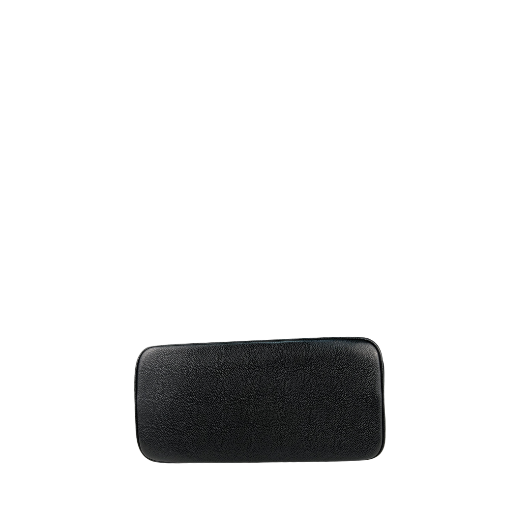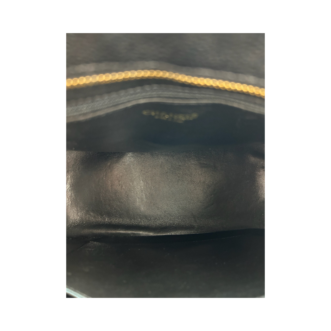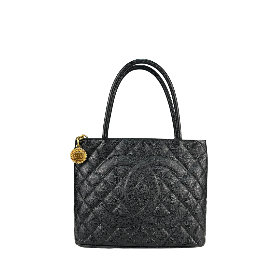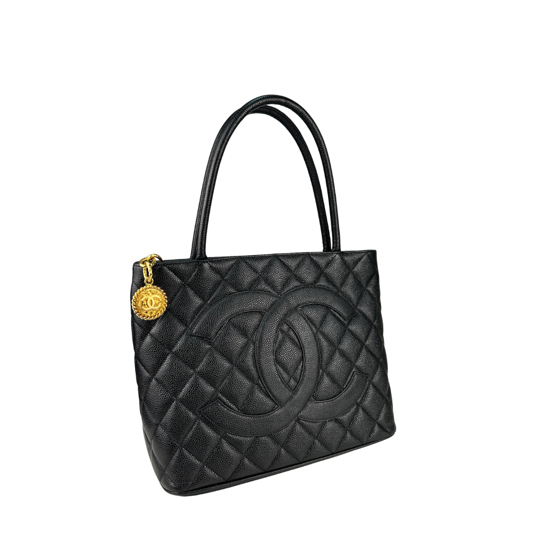 Black quilted caviar leather exterior with tonal leather interior and gold hardware. Features exterior patch pocket at back, two interior pockets, stitched and embossed CC logo at front, and zip closure with iconic logo medallion pull. Includes certificate of authenticity and original dust bag.