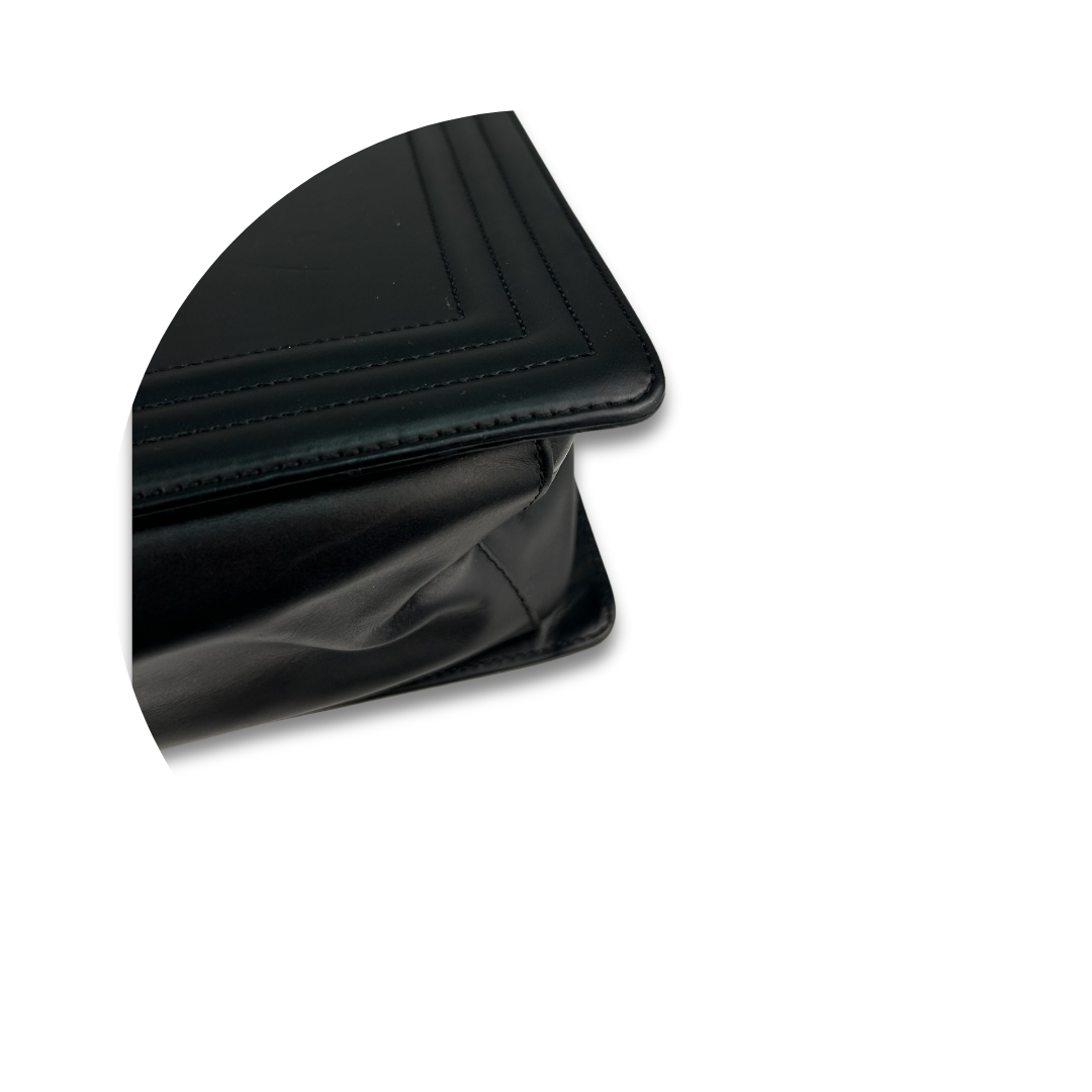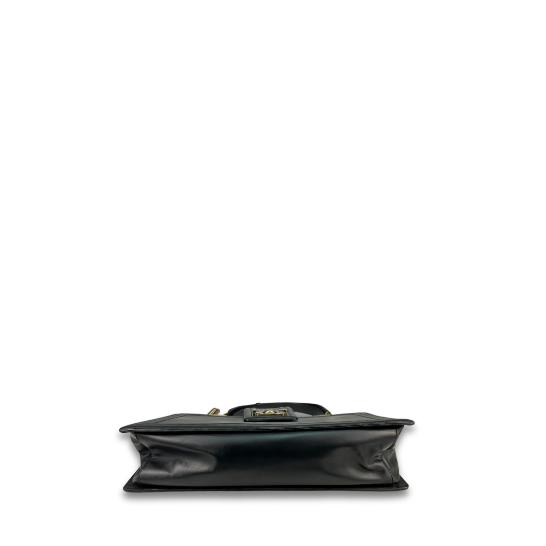 Black smooth calfskin exterior with black grosgrain and antique gold-tone hardware. Features leather top handles, chain shoulder strap, boy-clasp closure, and 3 interior pockets. Please note marks on leather exterior. Includes certificate of authenticity.