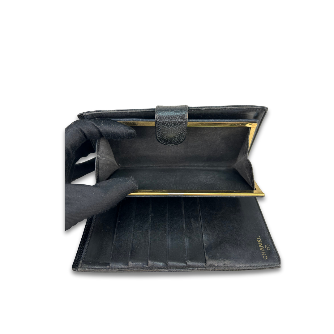 Black Caviar pebbled leather exterior with black lambskin interior and gold hardware. Features snap tab closure, 6 card slots, and kisslock change compartment. Please note minor corner wear as pictured. Includes certificate of authenticity.