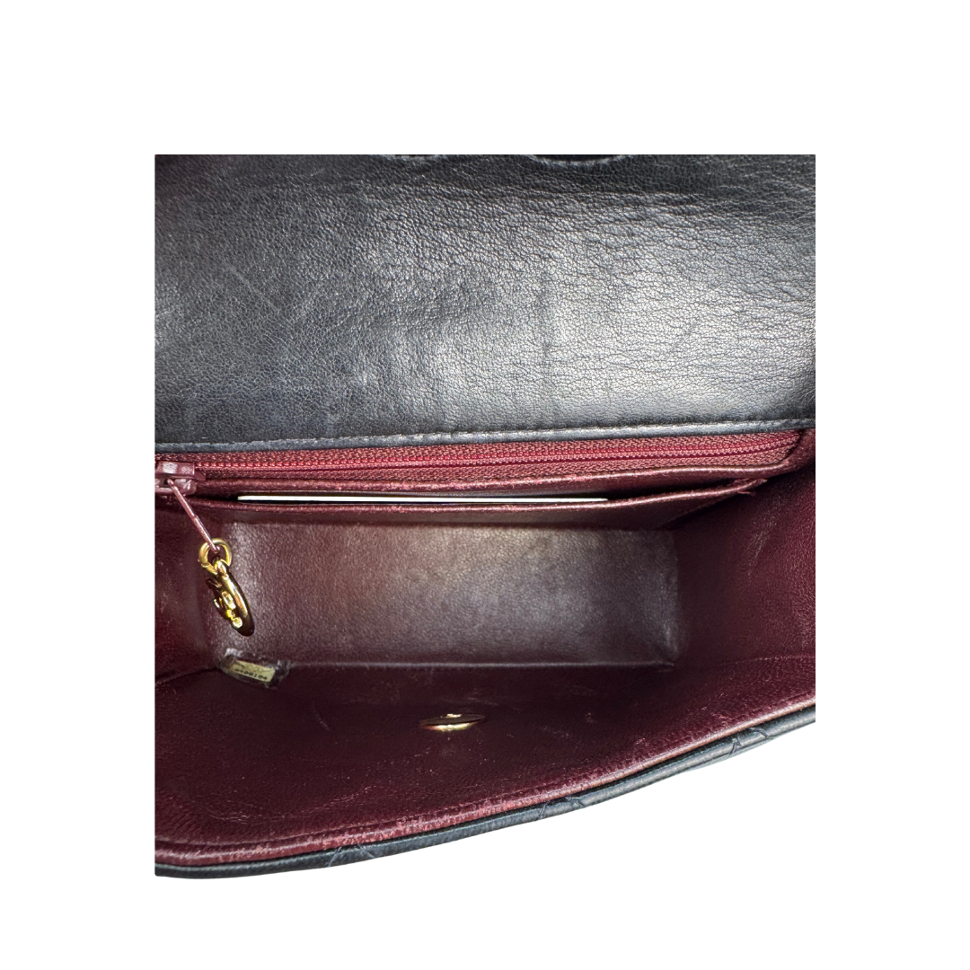 Black quilted lambskin exterior with burgundy calfskin interior and gold hardware. Features interlocking CC turnlock closure, leather woven chain strap, rear exterior patch pocket, interior zipper pocket, and interior patch pocket. Includes a certificate of authenticity, original dust bag, box, and card of authenticity.