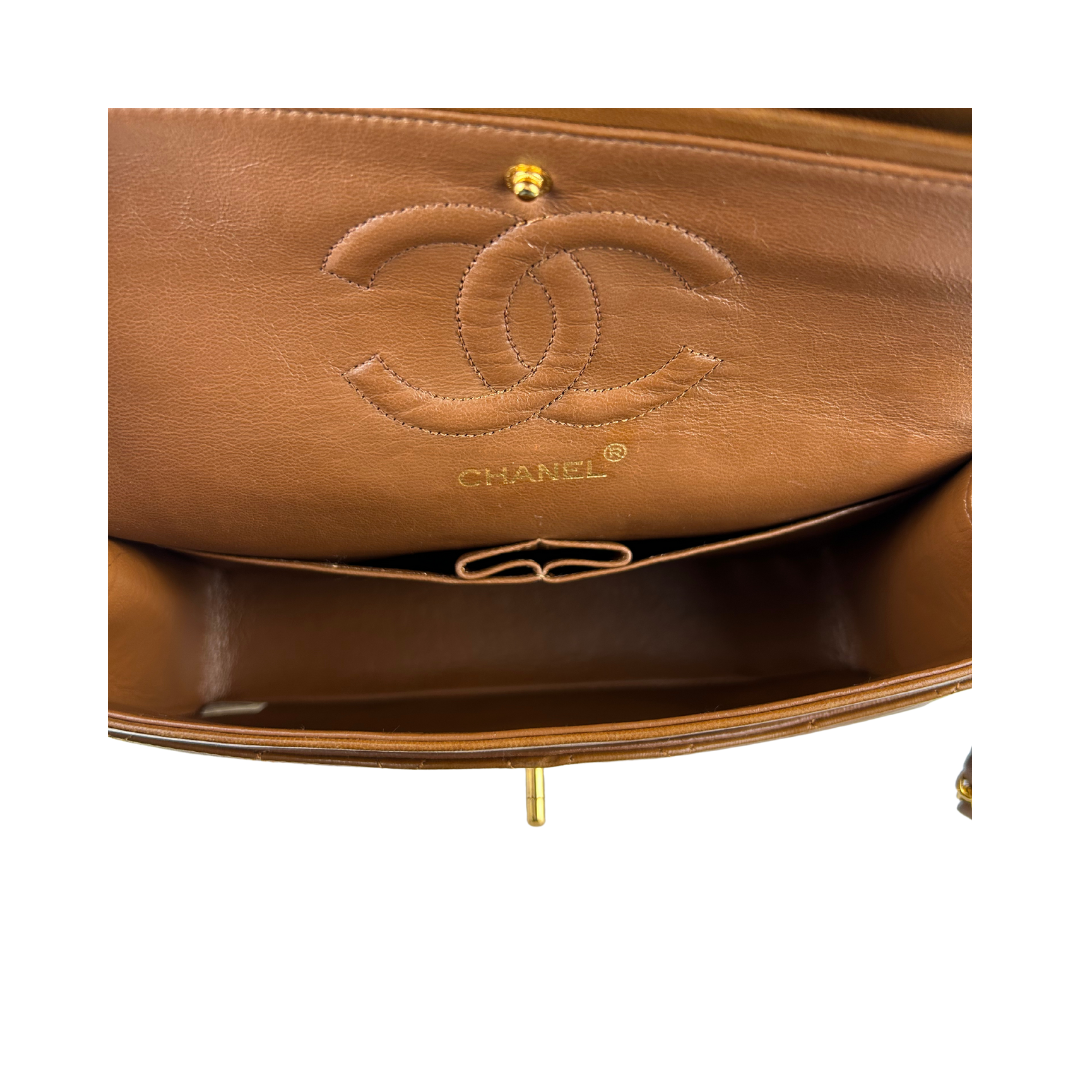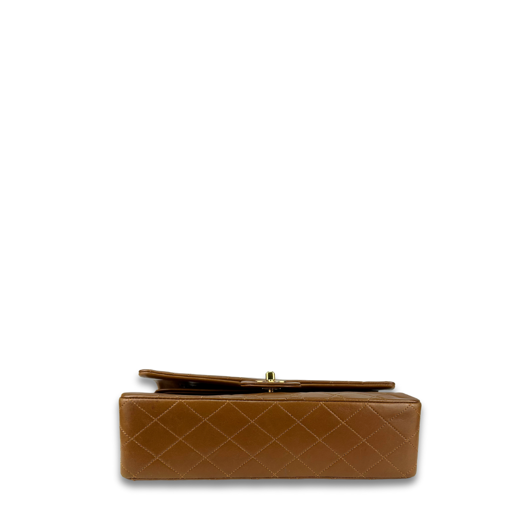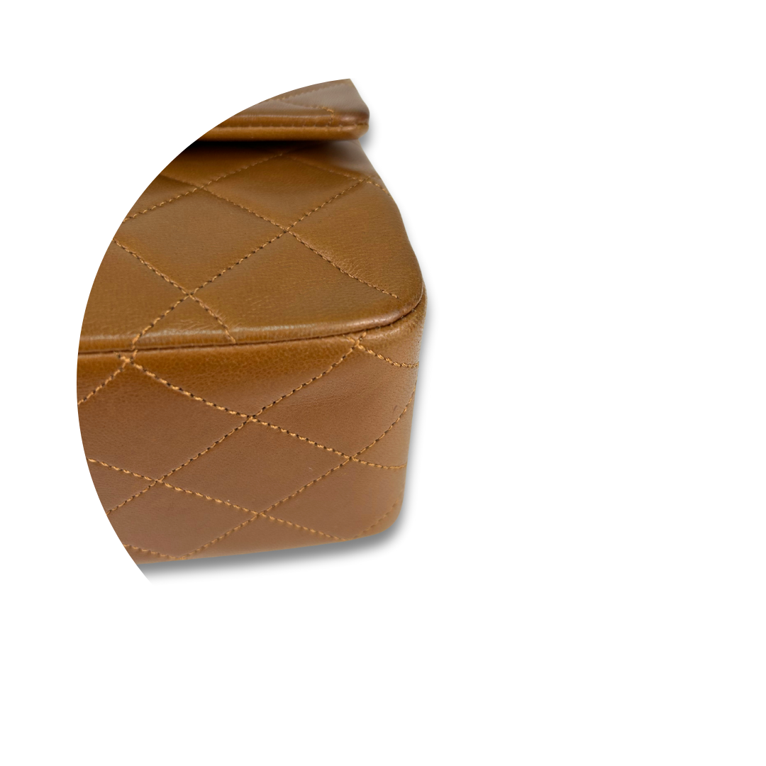 Camel quilted lambskin exterior with tonal calfskin interior and gold hardware. Features interlocking CC turnlock closure, rear exterior patch pocket, dual interior patch pockets, and leather-woven chain strap that can be worn singled or doubled. Please note minor corner wear. Includes certificate of authenticity, original dust bag, and original box.