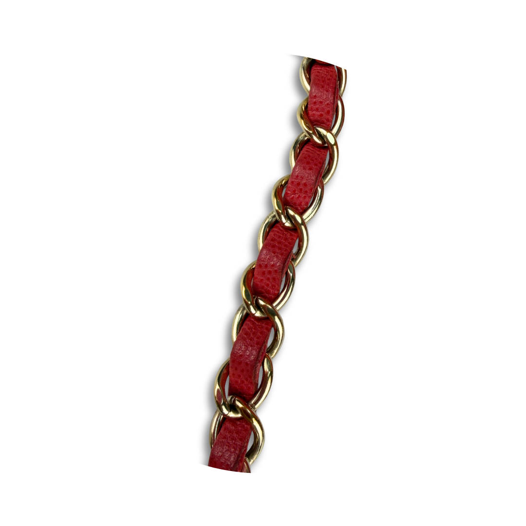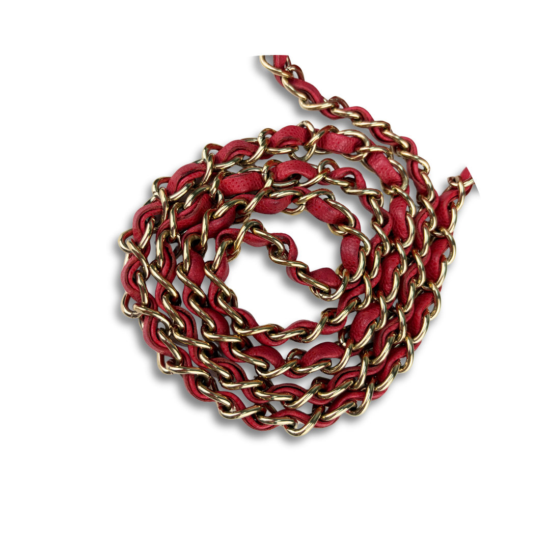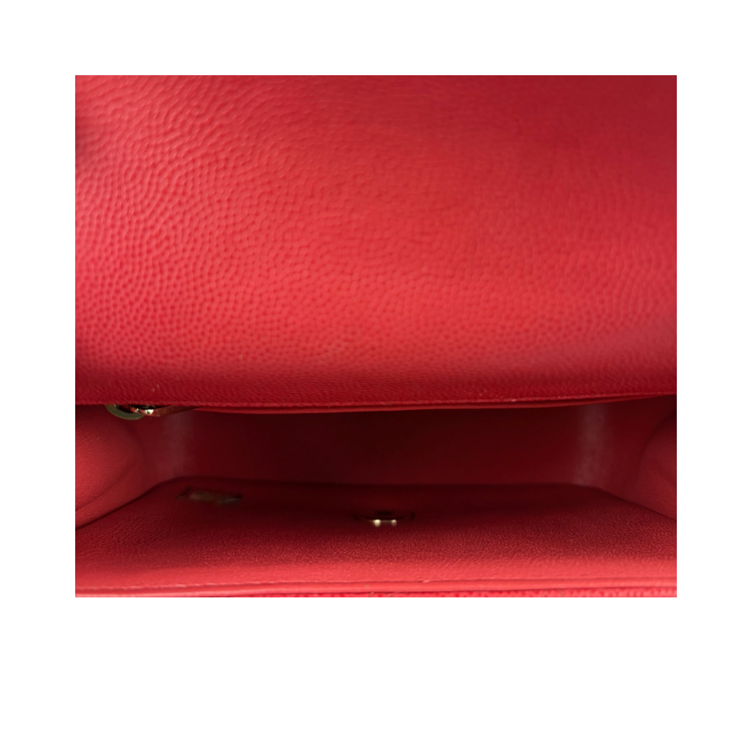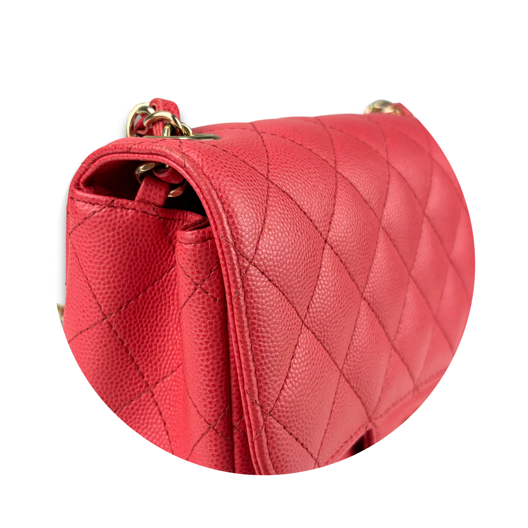 Dark pink caviar leather exterior with tonal interior and gold hardware. Features interlocking CC turnlock closure, leather woven chain strap, rear exterior patch pocket, interior zipper pocket, and interior patch pocket. Please note color transfer on back, edge, and chain wear as pictured. Includes a certificate of authenticity, original dust bag, and card of authenticity.