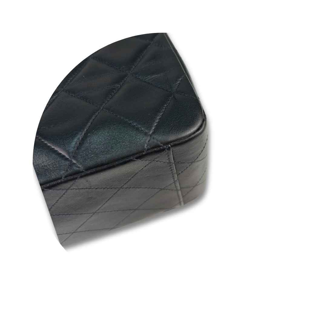 Black lambskin quilted exterior, burgundy calfskin interior, and gold hardware. Features interlocking CC turnlock closure, rear exterior patch pocket, interior pockets, and leather-woven chain strap that can be worn singled or doubled. Includes certificate of authenticity.