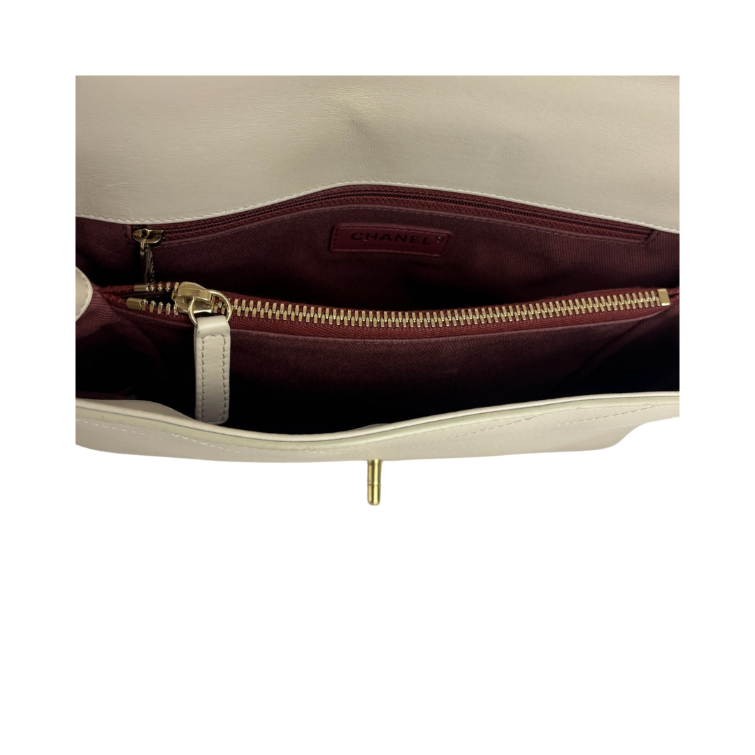 Cream lambskin exterior with red fabric interior and pale gold-tone hardware. Features interlocking CC turnlock closure, attached chainlink top handle and long chainlink shoulder strap, exterior pocket, and 2 interior zipper pockets. Please note mark on front flap. Includes certificate of authenticity and original dust bag.