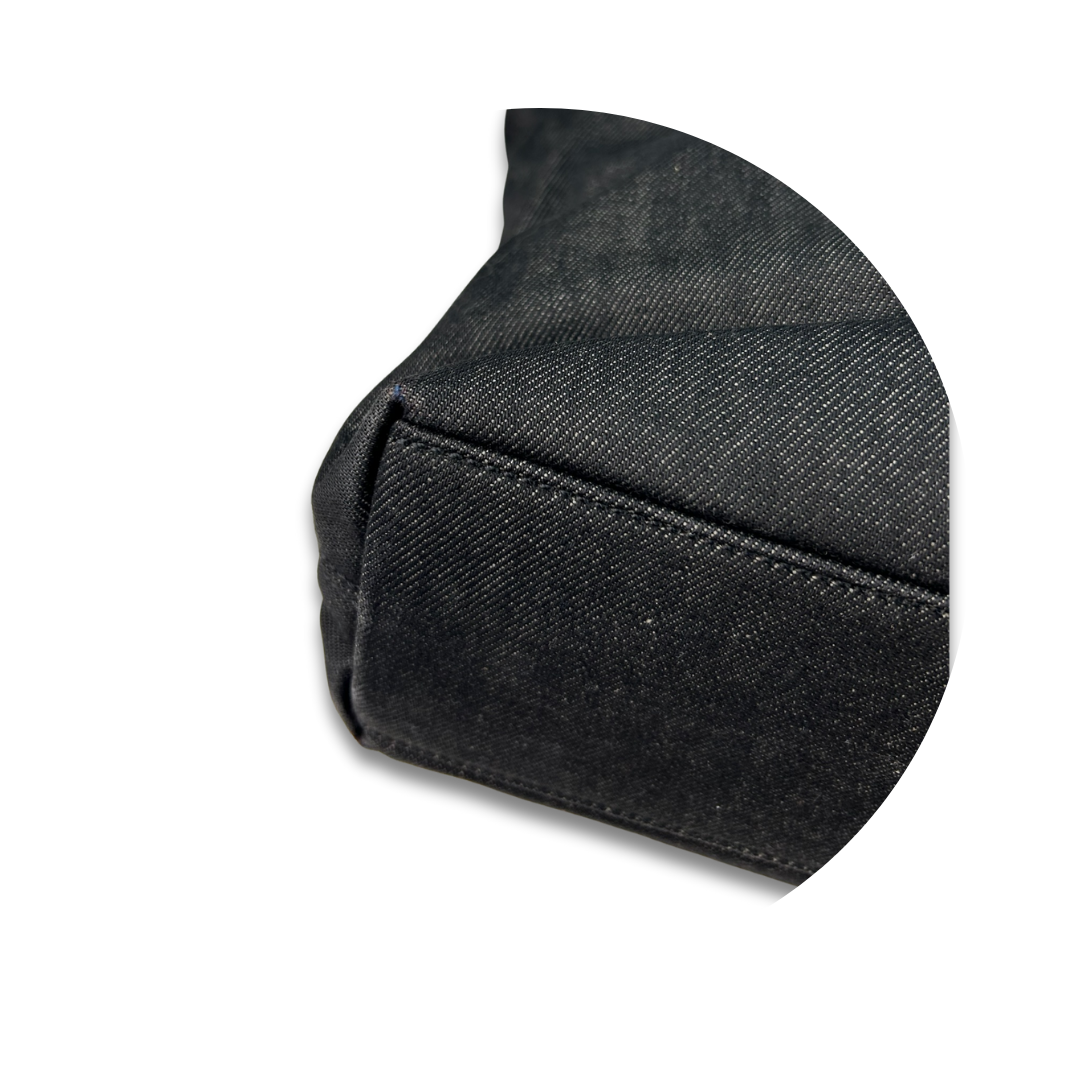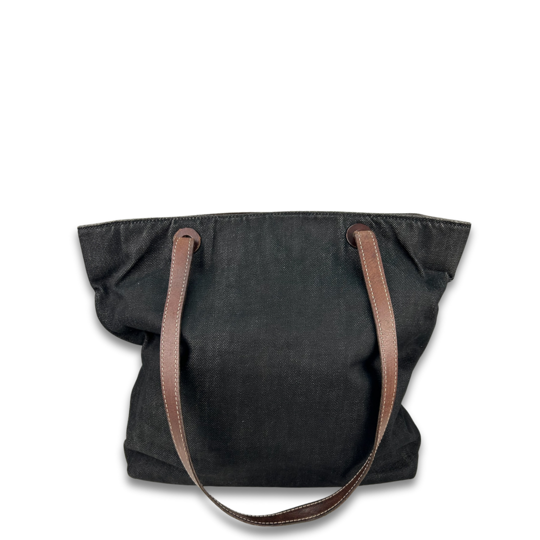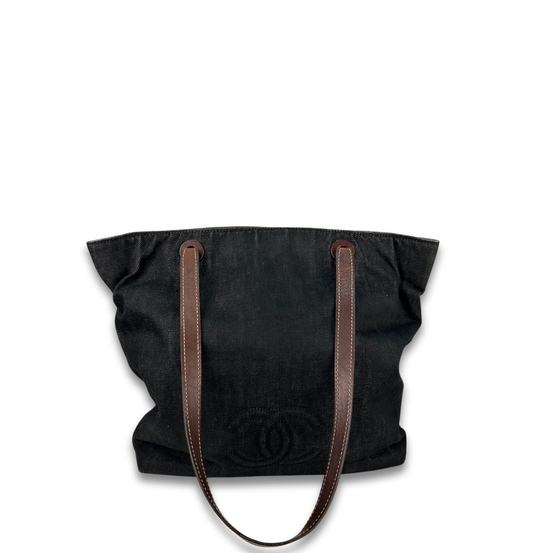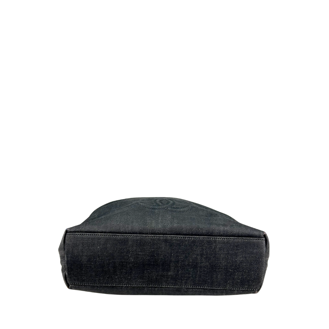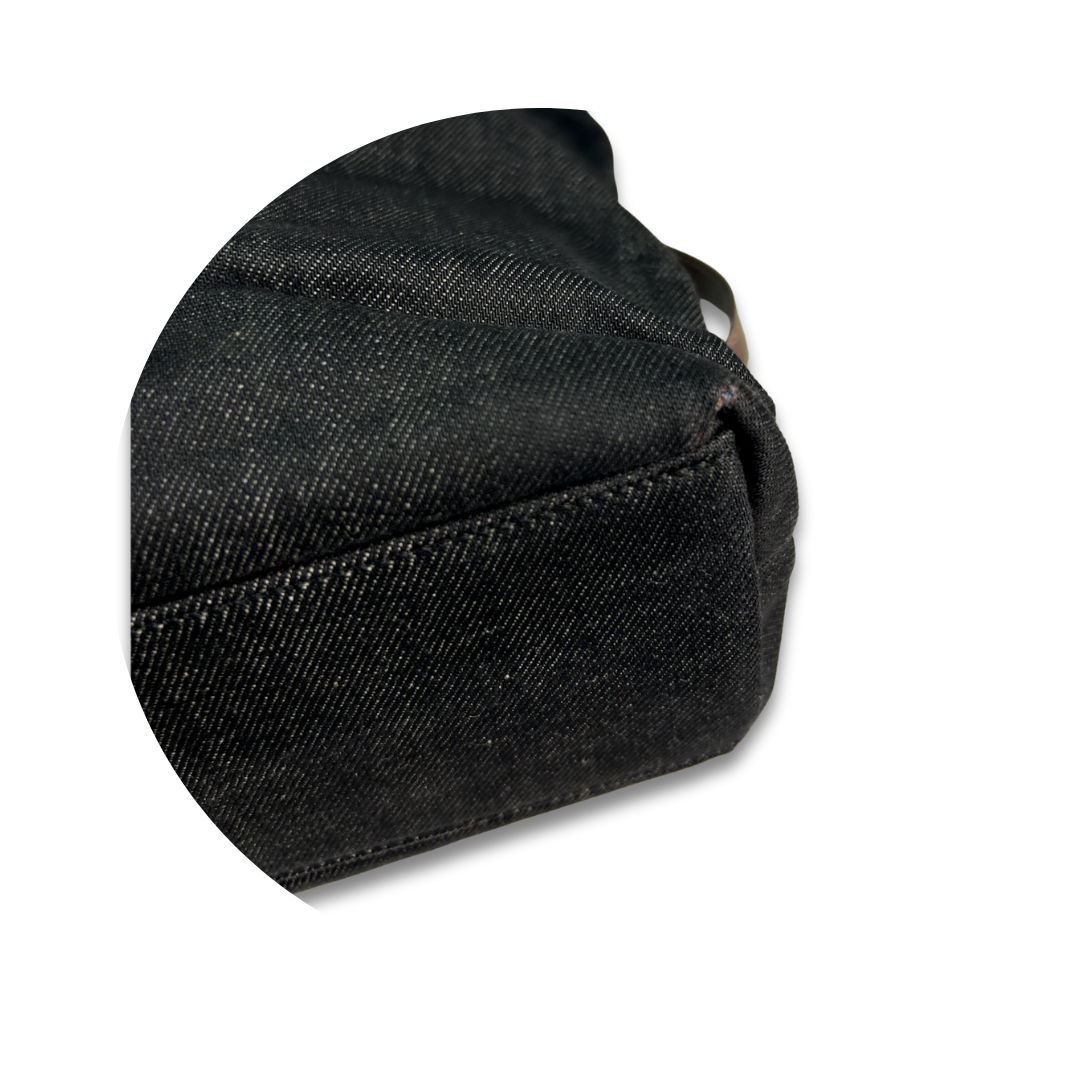 Deep denim exterior with brown leather trim, brown fabric interior, and antique gold-tone hardware. Features leather shoulder straps, magnetic closure, and 2 interior zipper pockets. Includes certificate of authenticity.