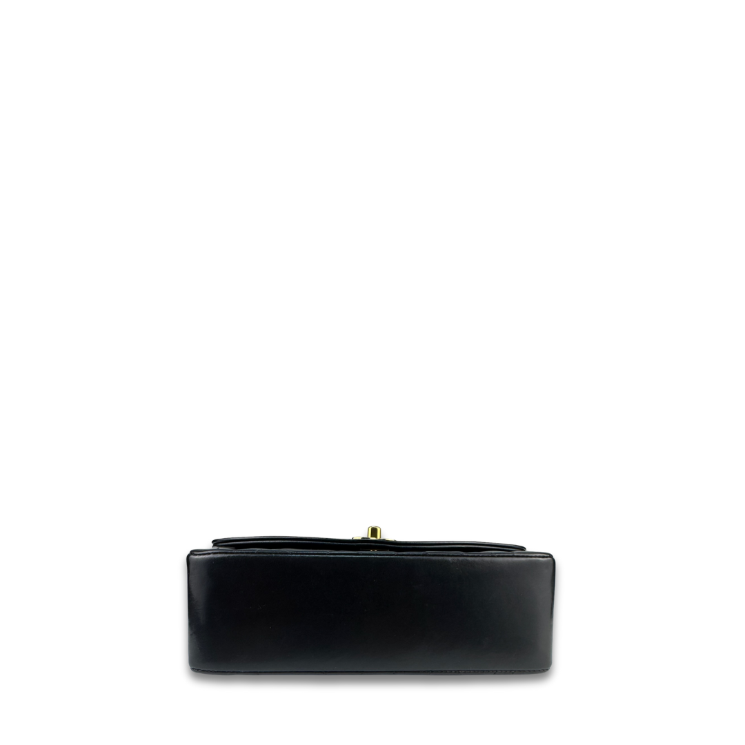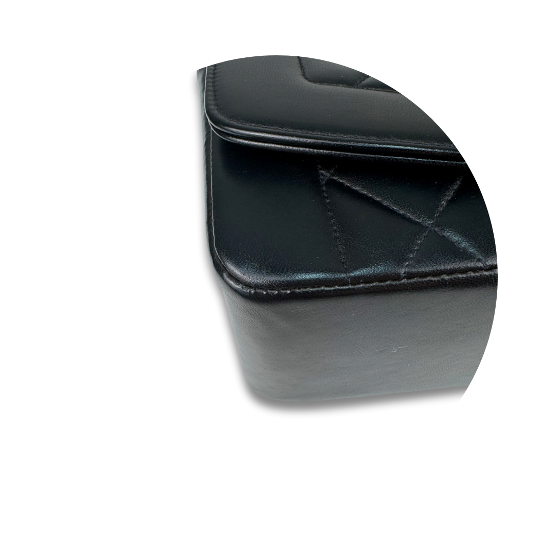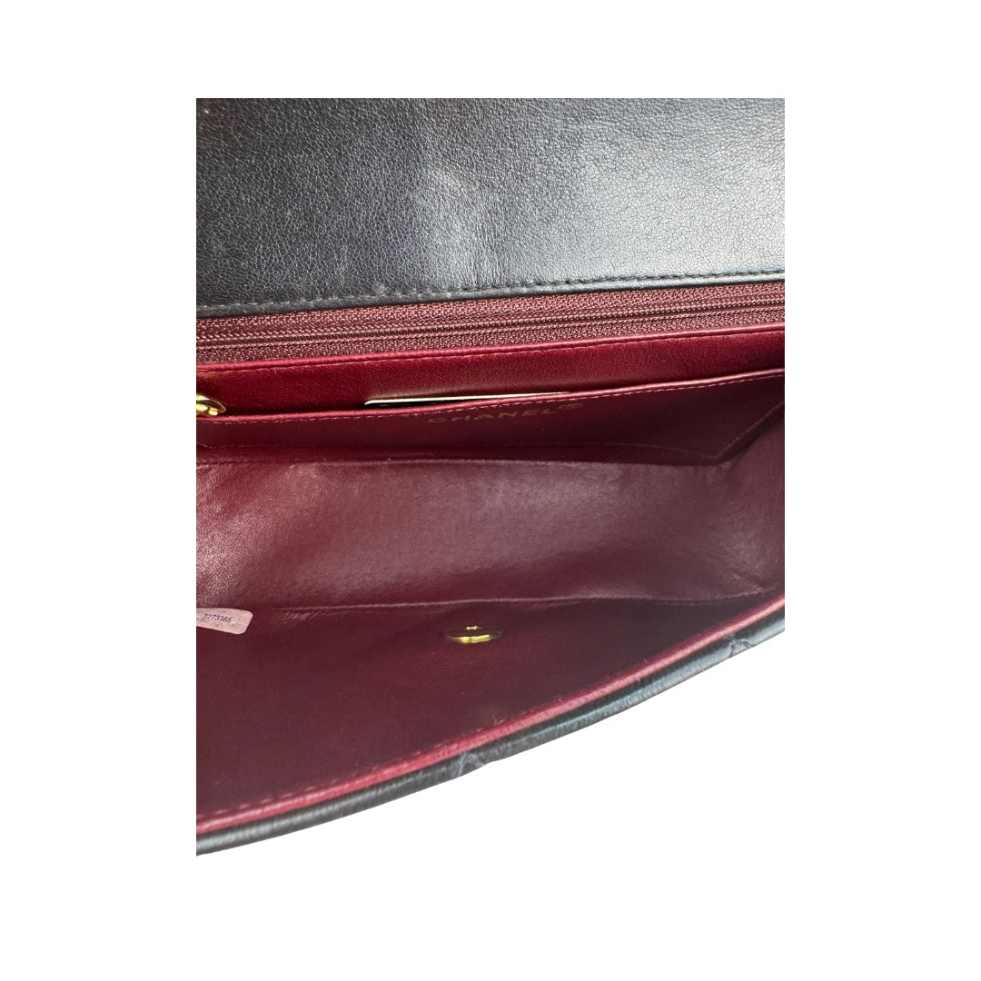 Black lambskin exterior with burgundy calfskin interior and gold hardware. Features interlocking CC turnlock closure, detachable leather-woven chain strap, and 2 interior pockets. Includes certificate of authenticity, original dust bag, and authenticity card.