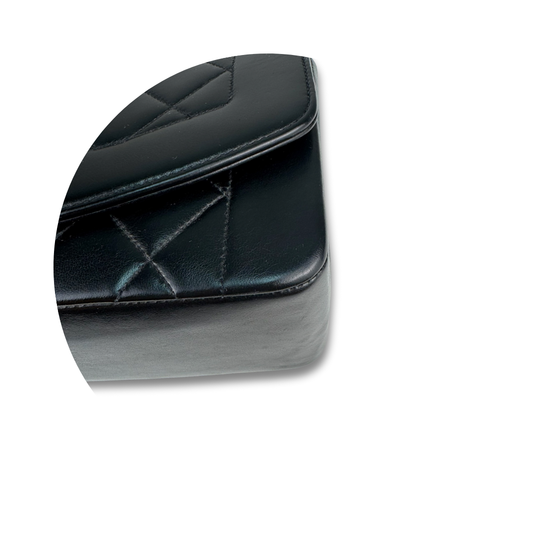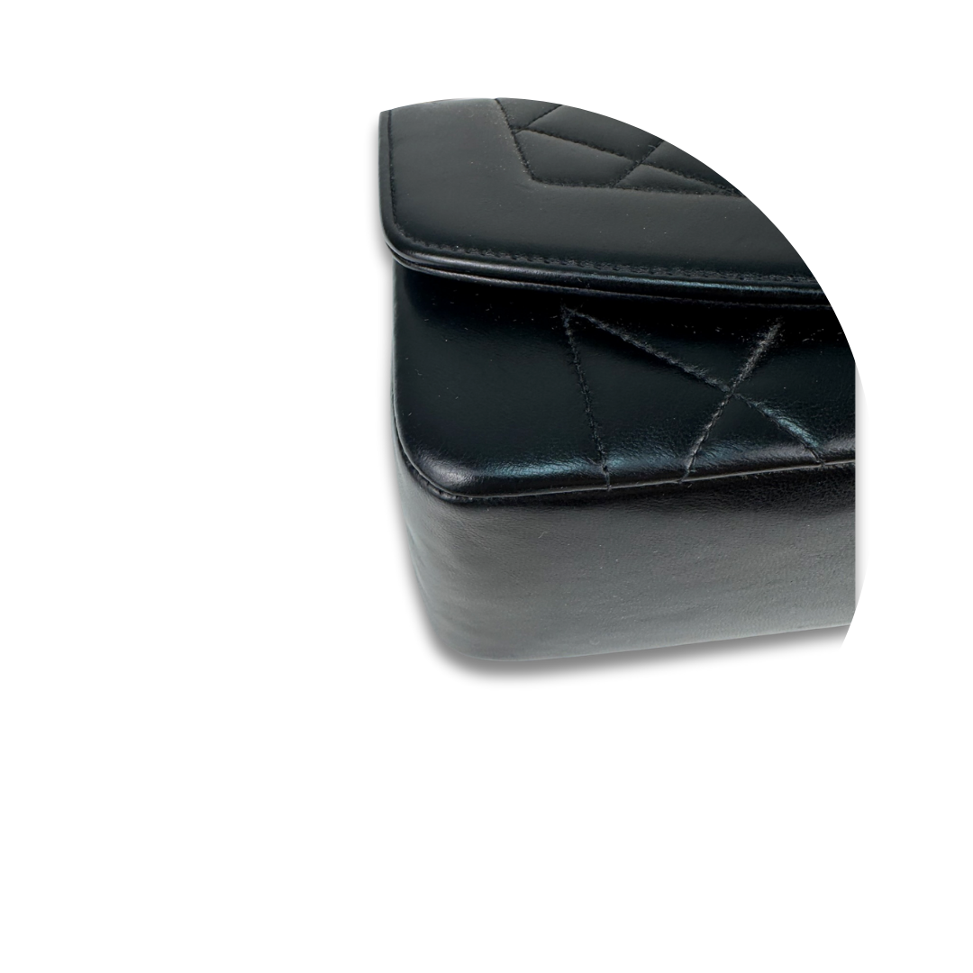 Black lambskin exterior with tonal calfskin interior and gold hardware. Features interlocking CC turnlock closure, detachable leather-woven chain strap, and 2 interior pockets. Includes certificate of authenticity, original dust bag, and authenticity card.