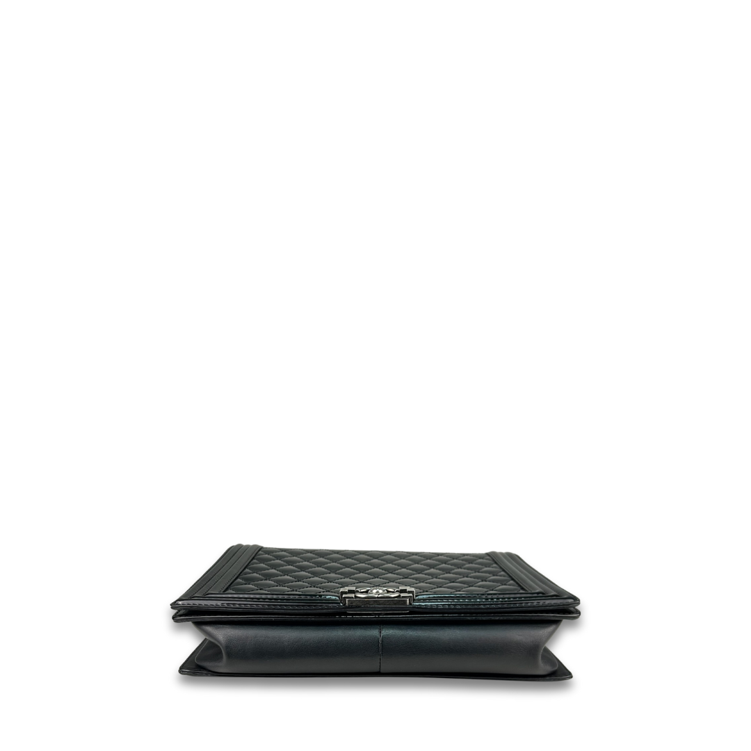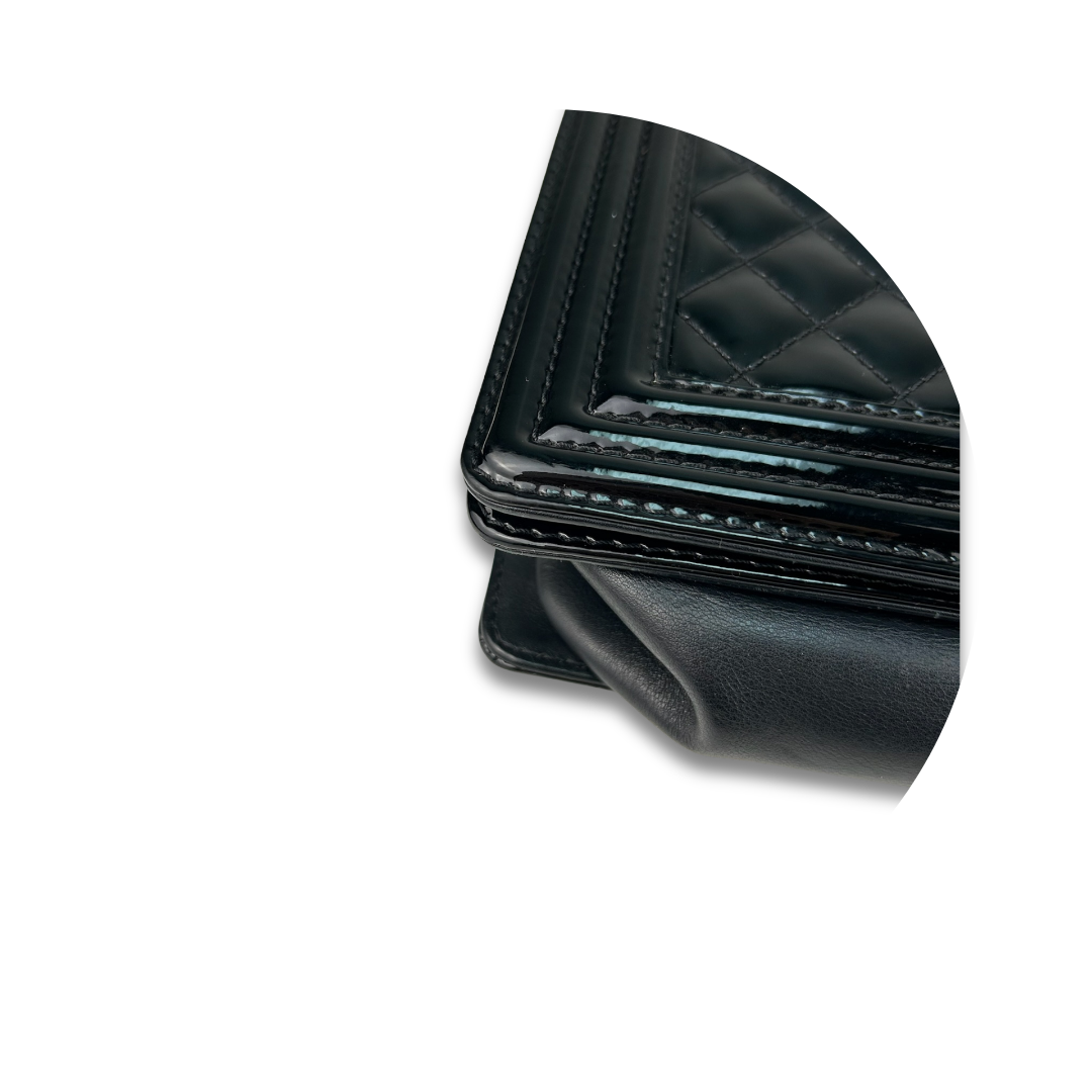 Black patent leather exterior with tonal grosgrain interior and antique silver-tone hardware. Features push-lock closure, chain strap with adjustable patent leather shoulder guard, and interior zipper pocket. Includes certificate of authenticity.