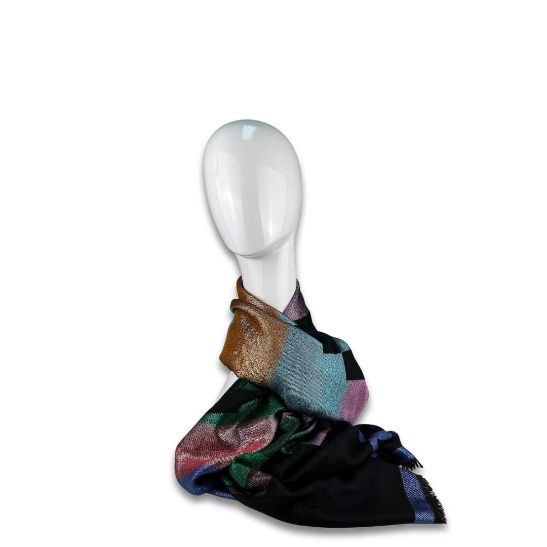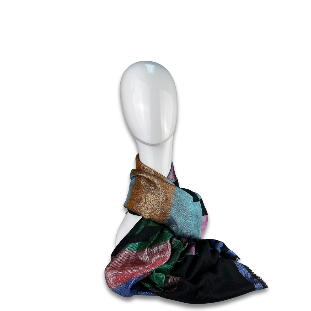 Black cashmere/silk blend shawl with multicolored metallic threading throughout. Features frayed edges. Includes certificate of authenticity.
