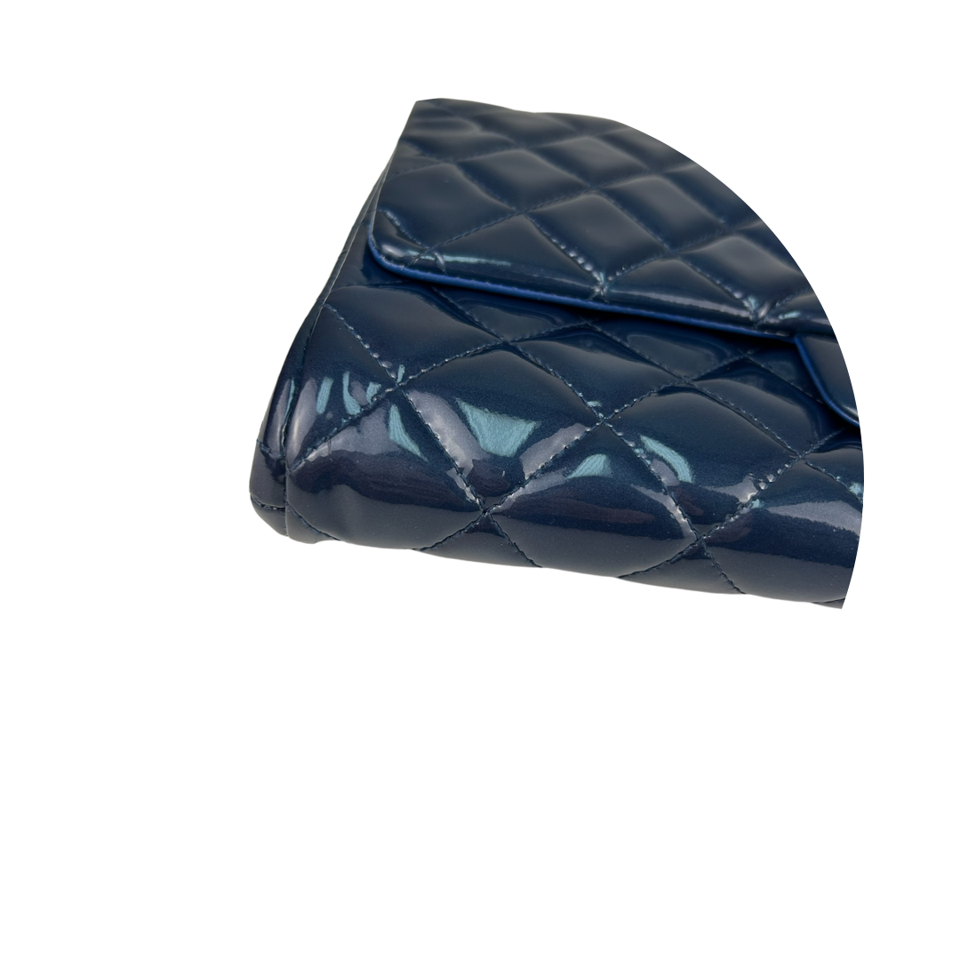 Navy patent leather exterior with blue calfskin interior and gunmetal hardware. Features CC turnlock closure, exterior pocket, leather-woven chain shoulder strap, and interior pocket. Please note wear on chain. Includes certificate of authenticity.