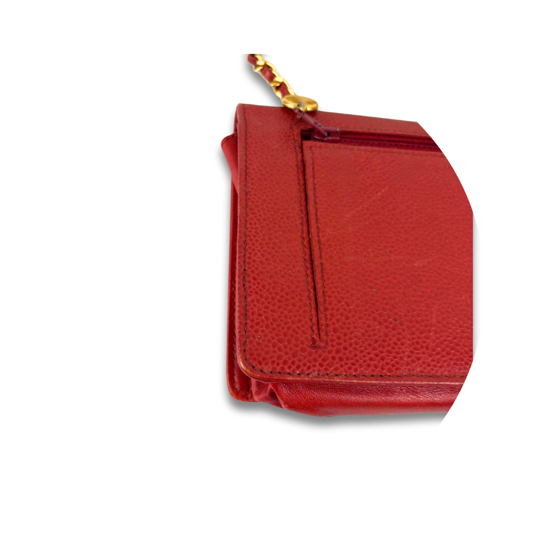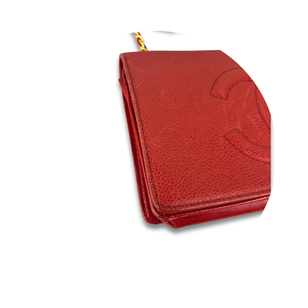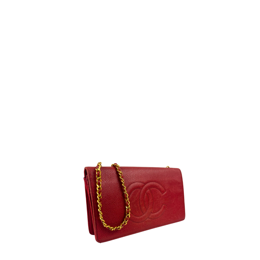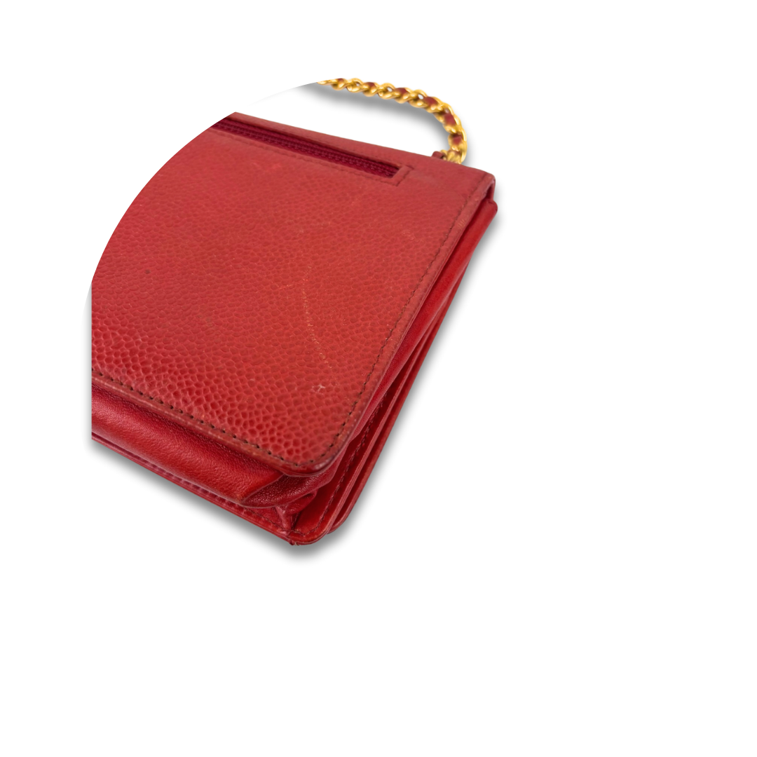 Black Caviar pebbled leather exterior with tonal grosgrain interior and gold hardware. Features snap closure, exterior zipper pocket, 2 interior pockets, and 6 card slots. Please note scratches on leather and corner wear. Includes certificate of authenticity.