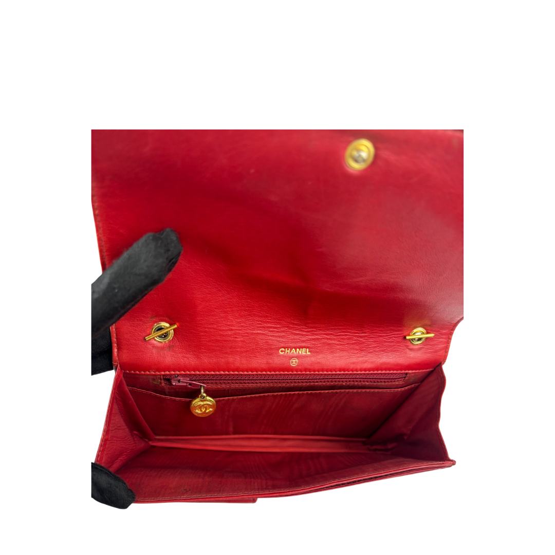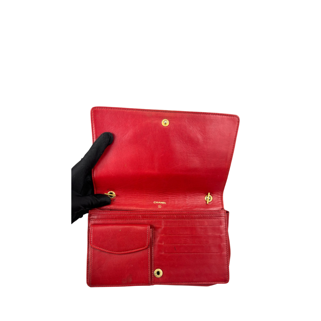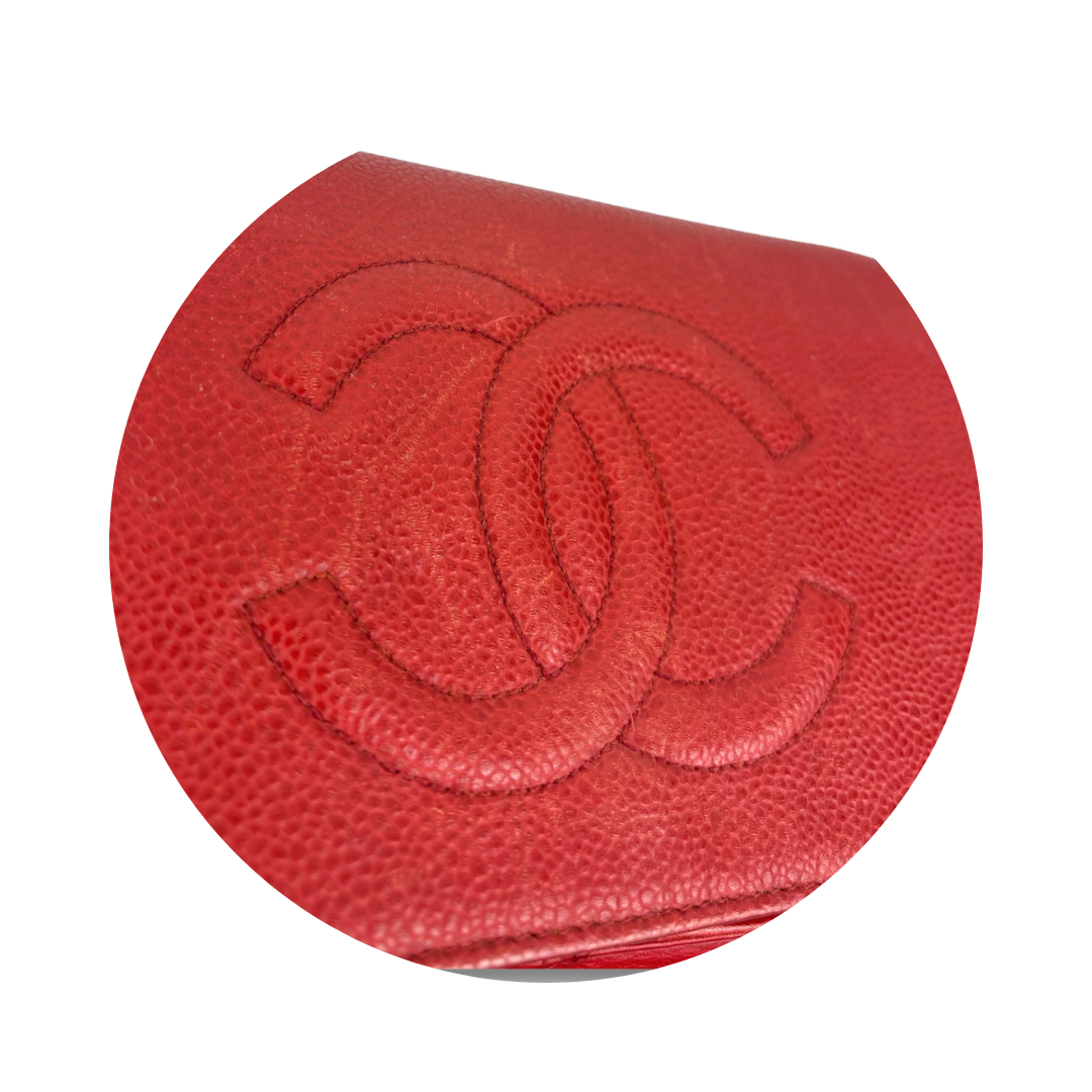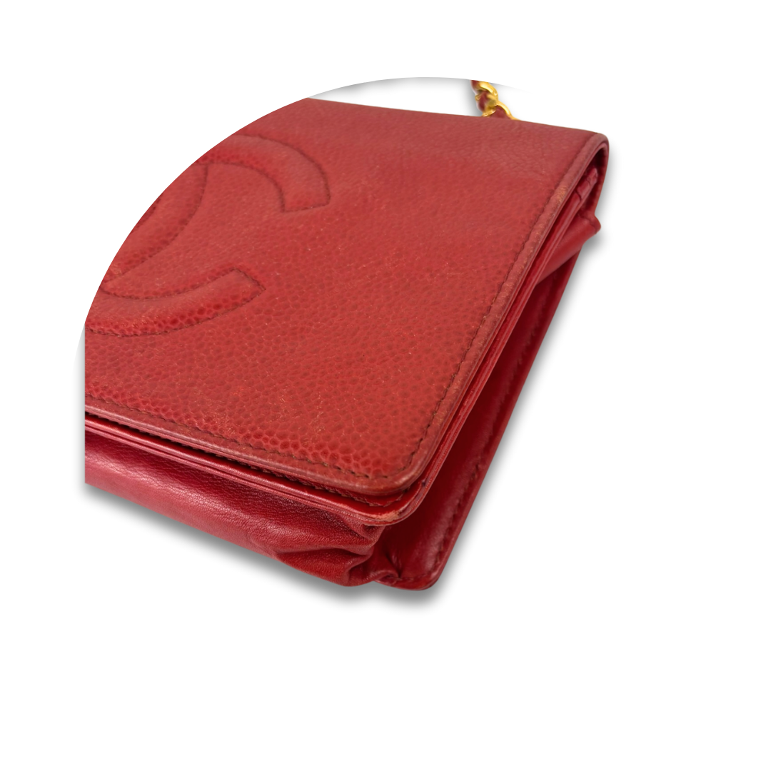 Black Caviar pebbled leather exterior with tonal grosgrain interior and gold hardware. Features snap closure, exterior zipper pocket, 2 interior pockets, and 6 card slots. Please note scratches on leather and corner wear. Includes certificate of authenticity.