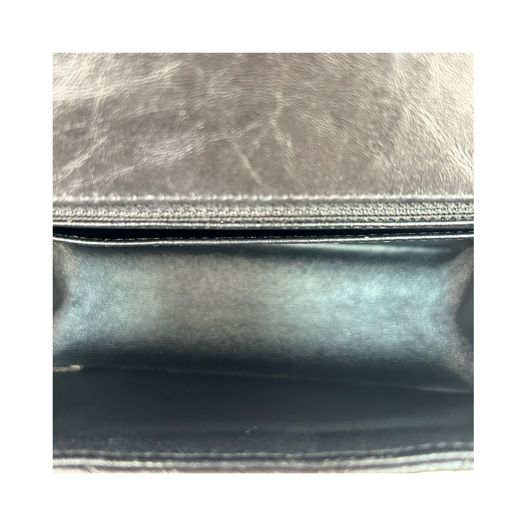 Black chevron-quilted aged calfskin exterior with tonal calfskin interior and black hardware. Features Mademoiselle turnlock closure, bijoux chain strap, exterior patch pocket, and interior zipper pocket. Includes certificate of authenticity.