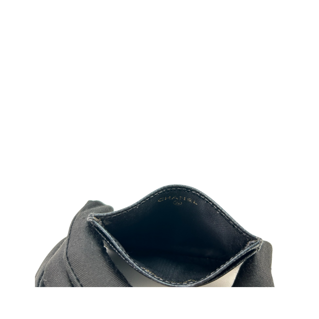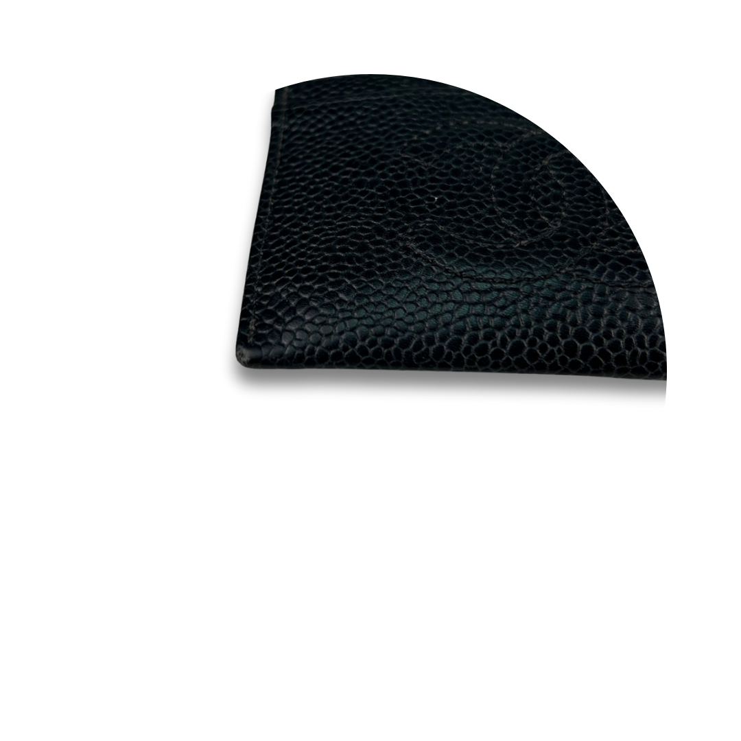 Black caviar leather exterior with black grosgrain interior. Features 3 exterior card slots and central compartment. Includes certificate of authenticity.