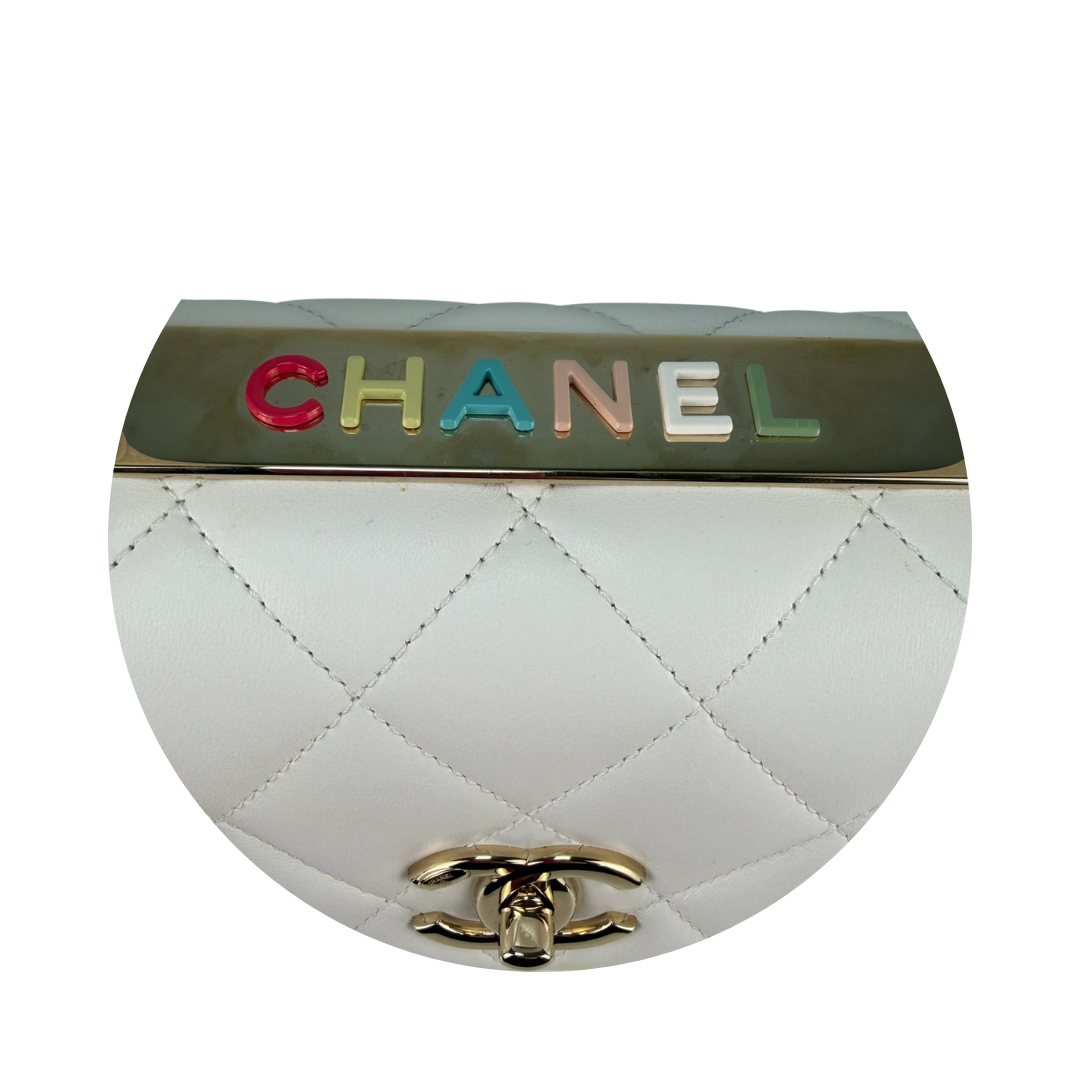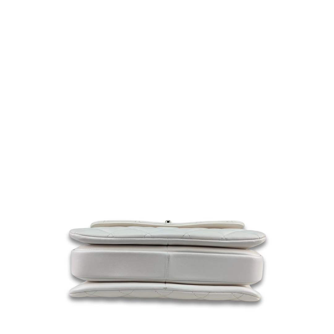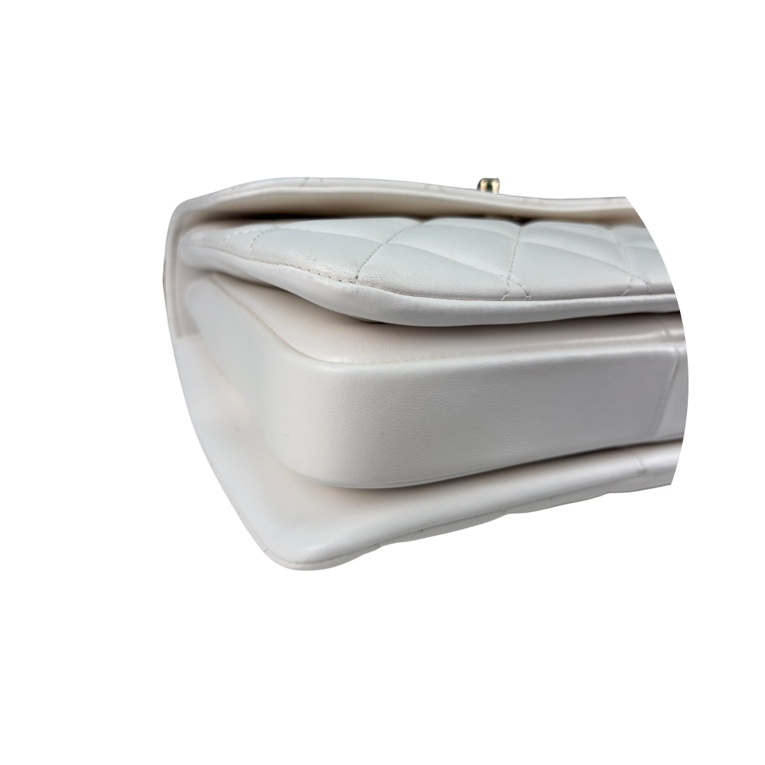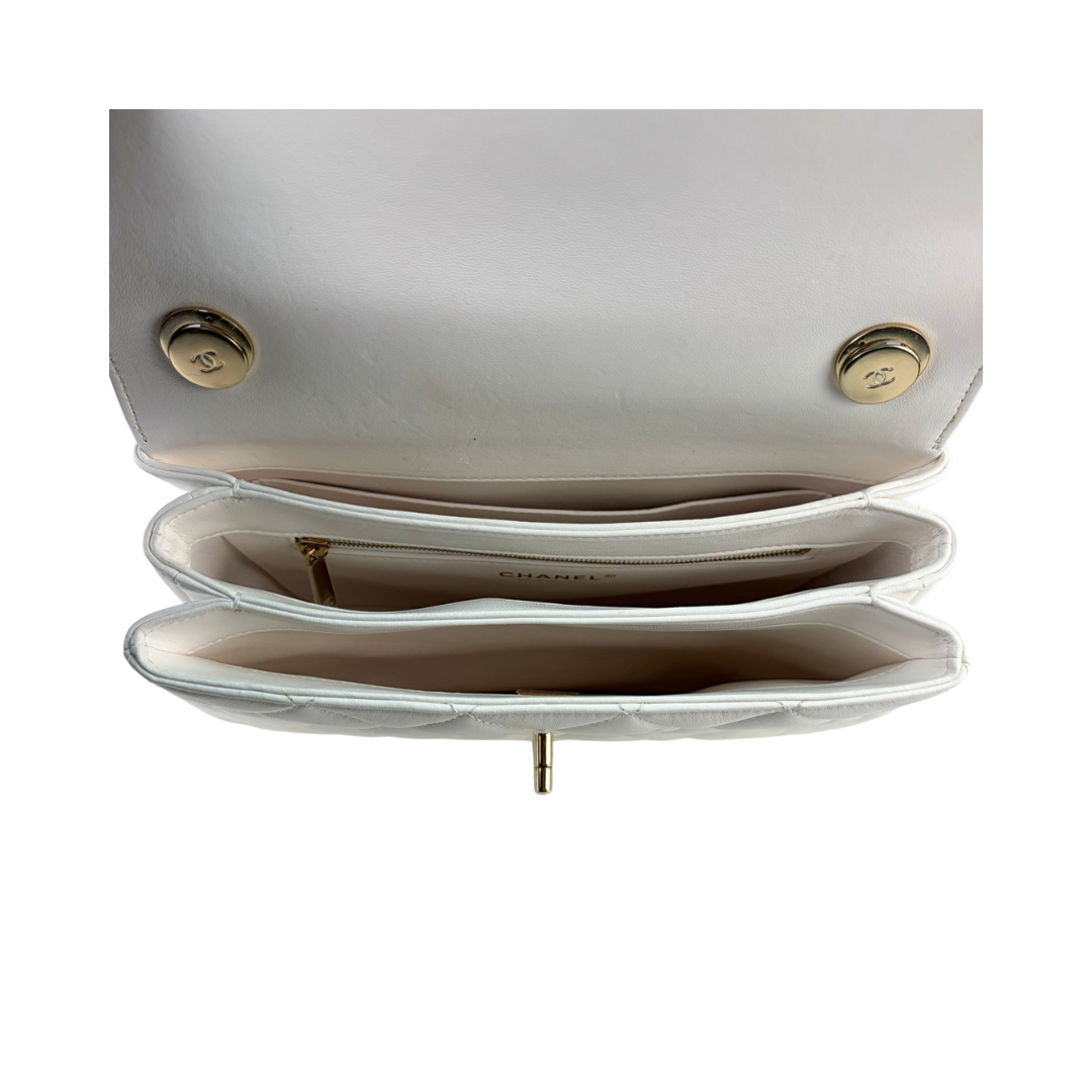 White quilted lambskin exterior with tonal calfskin interior and champagne-tone hardware. Features CC Turnlock closure, white leather top-handle, leather-woven chain strap with leather shoulder pad, champagne-tone Chanel plate with multicolored enamel lettering, one exterior pocket, divided interior, and interior zipper pocket. Includes certificate of authenticity and original dust bag.