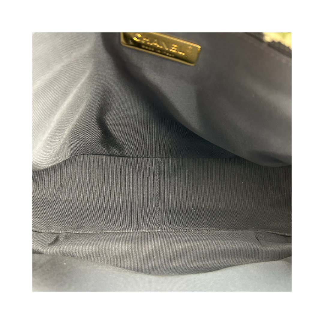 Navy blue and cream tweed exterior with multicolored threads, navy grosgrain interior, and mixed-tone hardware. Features aged gold-tone top handle chain, chain-detailed CC turnlock clasp, exterior snap pocket, mixed-hardware strap with leather shoulder guard, and interior zipper pocket. Includes original dust bag and certificate of authenticity.