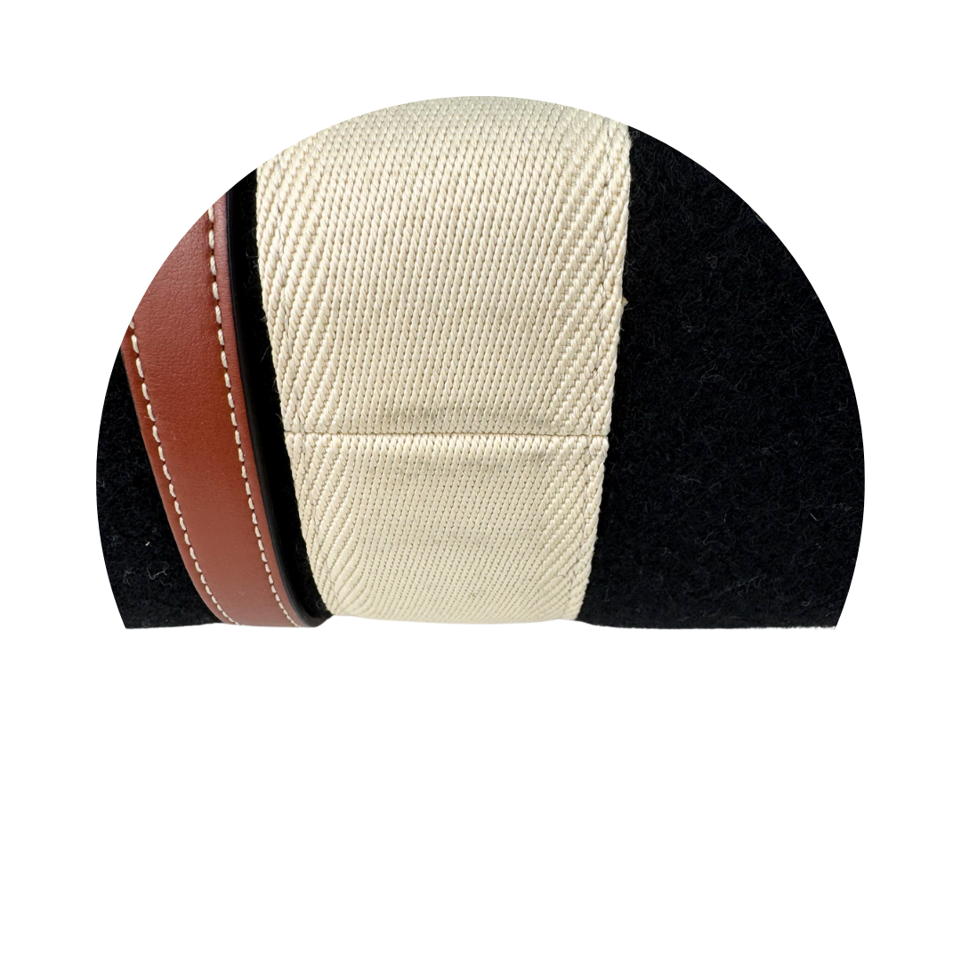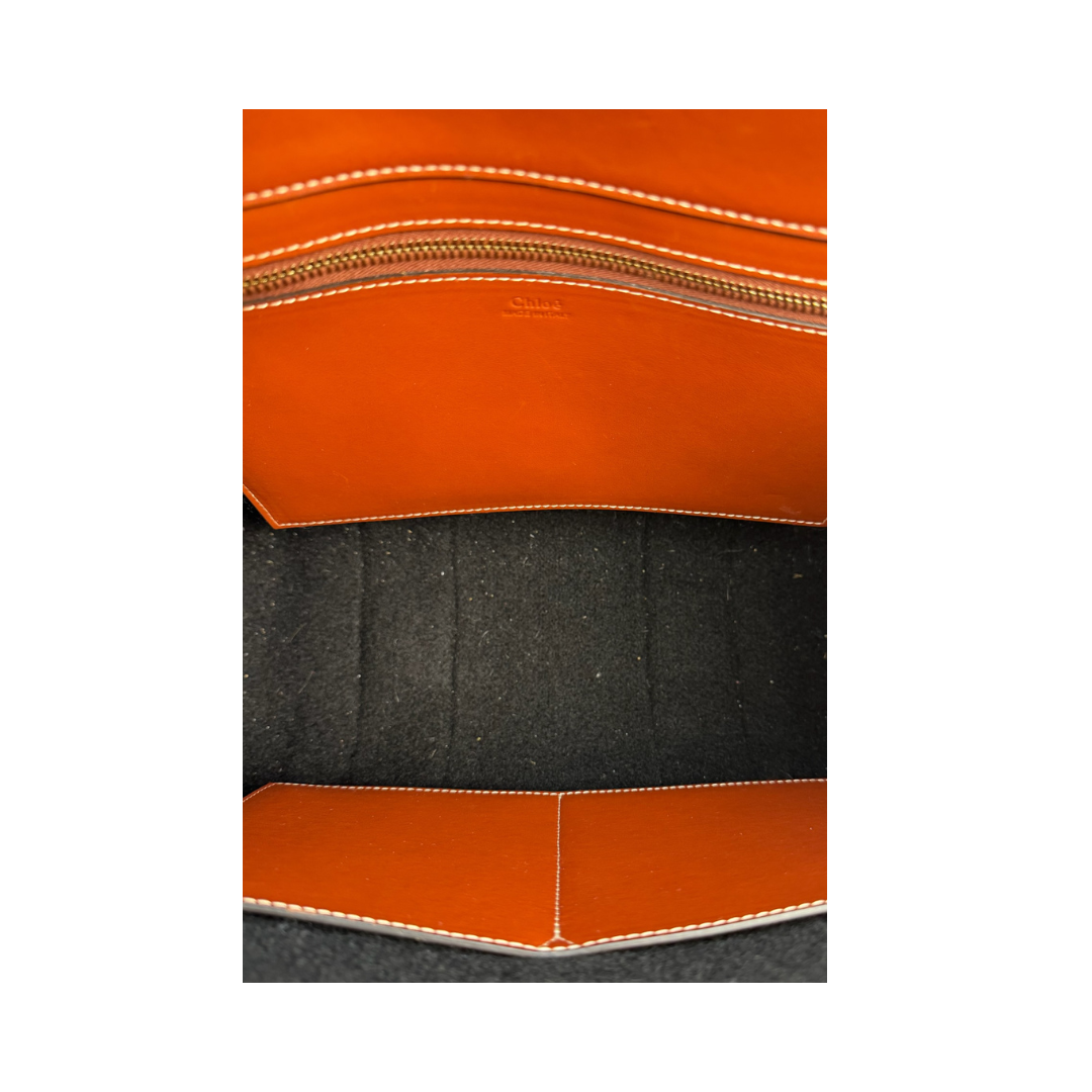 Black felt exterior with tan calfskin trim and matching interior. Features Chloé logo ribbon, removable crossbody leather strap, open top, and interior patch pocket. Includes certificate of authenticity.