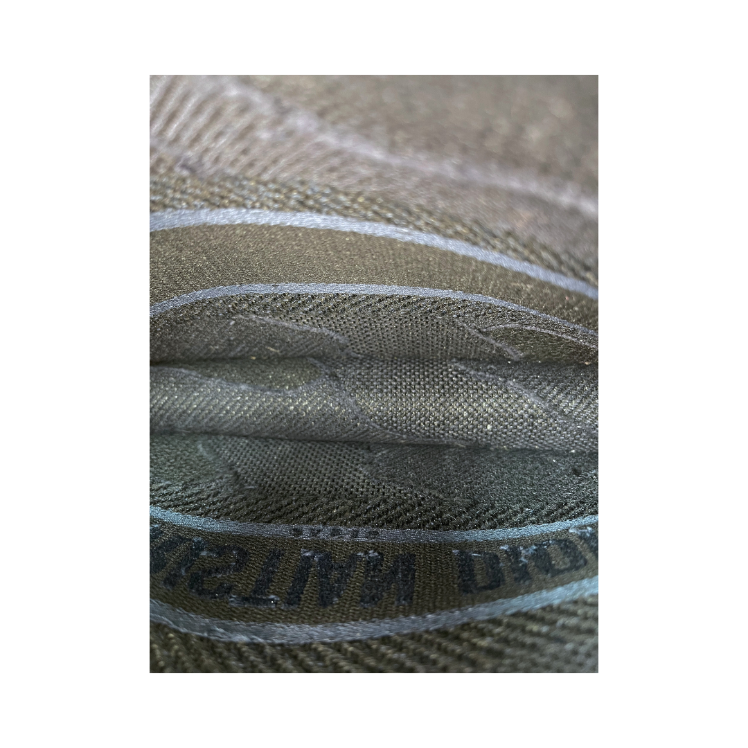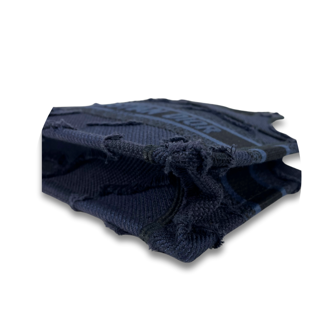 Navy blue and black distressed camouflage embroidered canvas exterior with unlined interior. Features fixed flat top handles and open top. Includes certificate of authenticity.