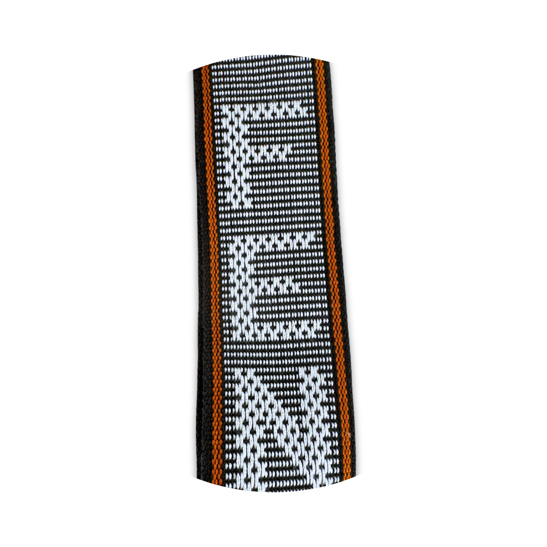 Black, brown, and white canvas strap with black leather attachments, and gold-tone hardware. Includes certificate of authenticity.