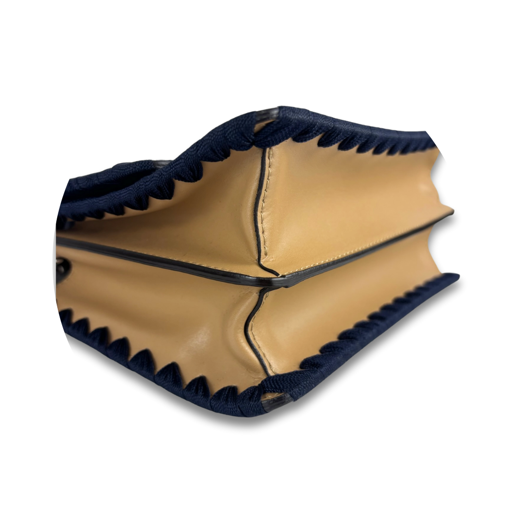 Beige leather exterior with brown suede interior and silver-tone hardware. Features navy blue ribbon whipstitch detail, chain shoulder strap, enamel stud clasp closure, and divided interior with single card slot. Includes certificate of authenticity.