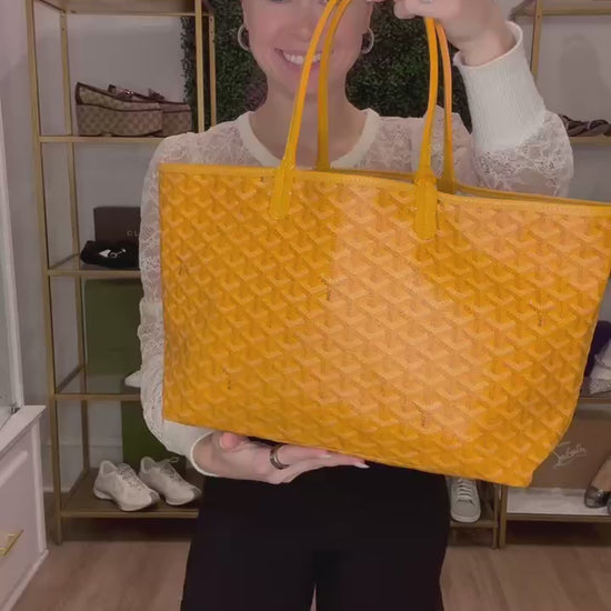 Yellow Goyardine coated canvas exterior with yellow calfskin trim and beige linen interior. This tote is reversible and features a removable inside pocket for easy access. Please note, there are 2 areas where the coated canvas exterior has been punctured through, the canvas lining remains in tact. The bag is otherwise in excellent condition. Includes certificate of authenticity.