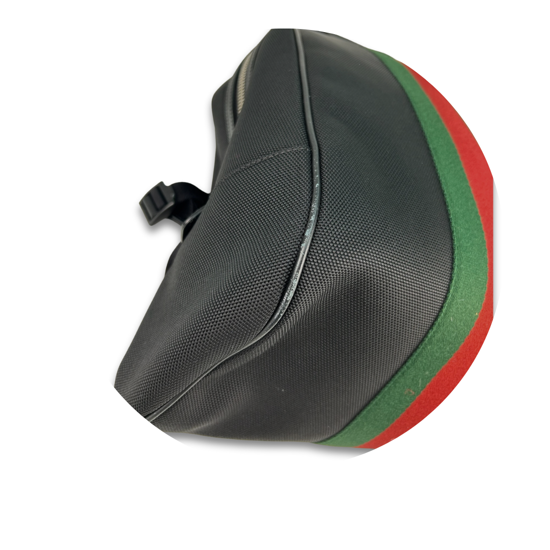 Black techno canvas exterior with black leather trim, black nylon interior, and silver-tone hardware. Features signature Gucci red and green webbing, leather top handle, dual zipper closure, padded and adjustable backpack straps, and several interior pockets. Please note wear on leather piping. Includes certificate of authenticity.
