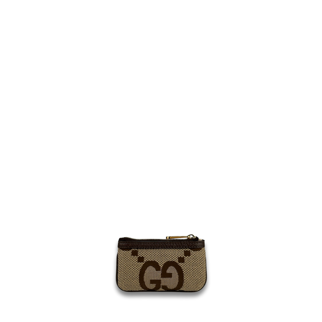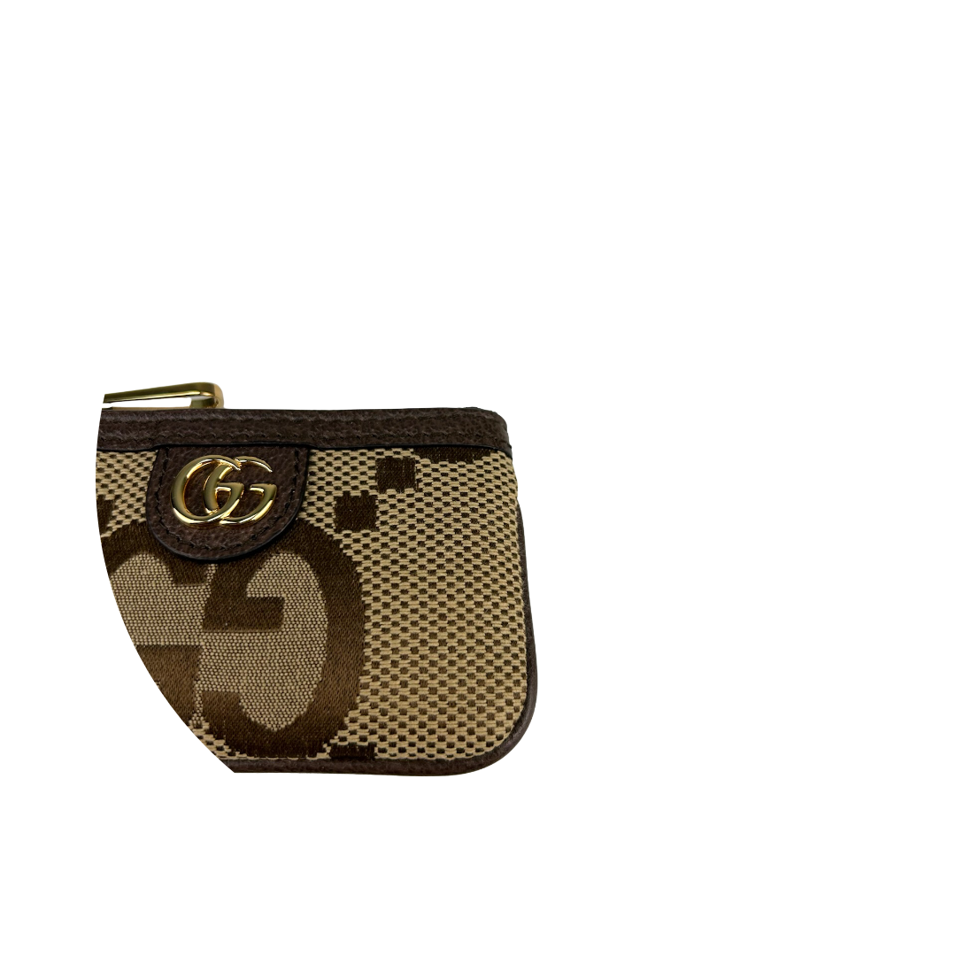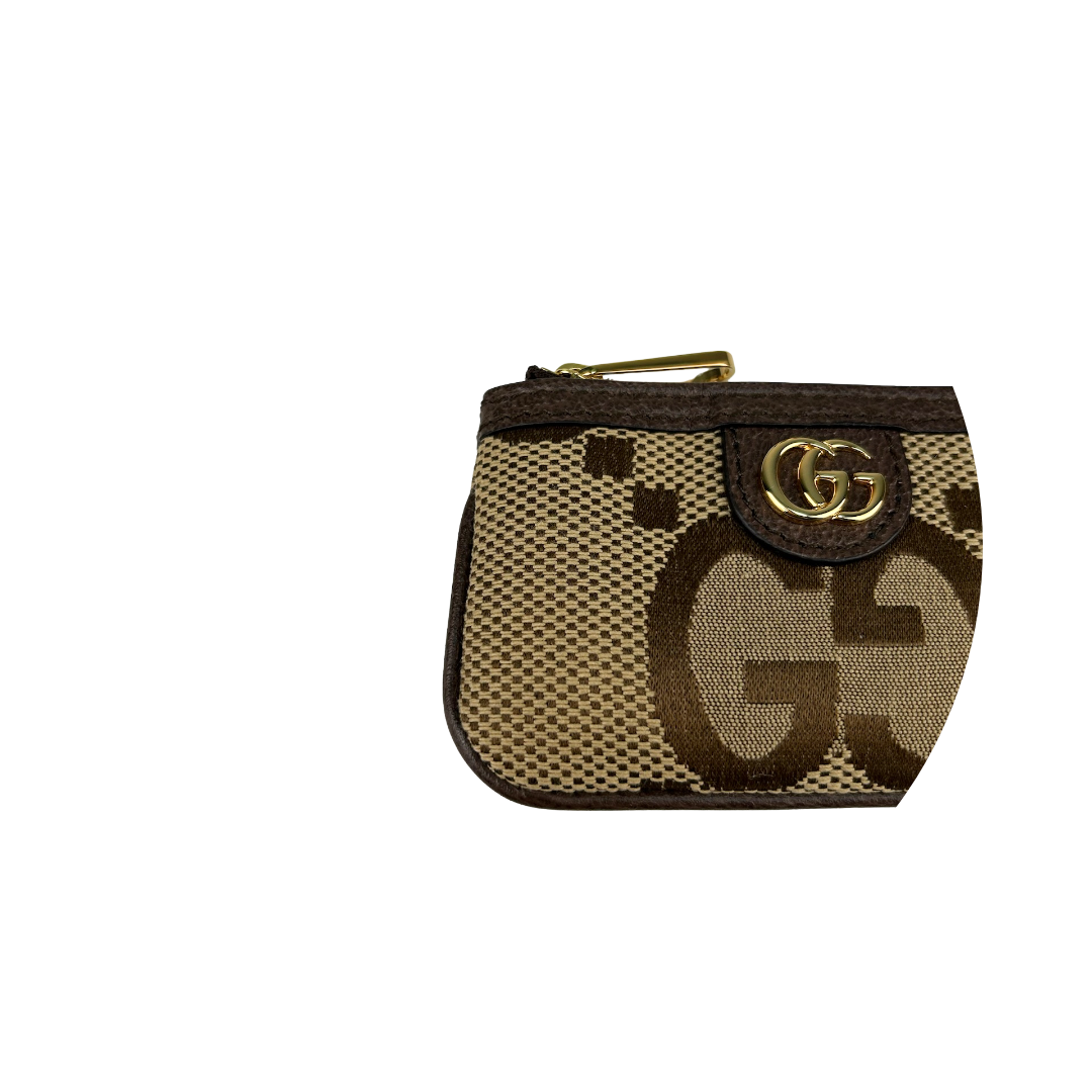 Brown and Beige Jumbo GG canvas exterior with brown leather trim, beige microfiber interior, and gold-tone hardware. Features zipper closure and interior D-ring key chain. Includes certificate of authenticity, original dust bag, and box.