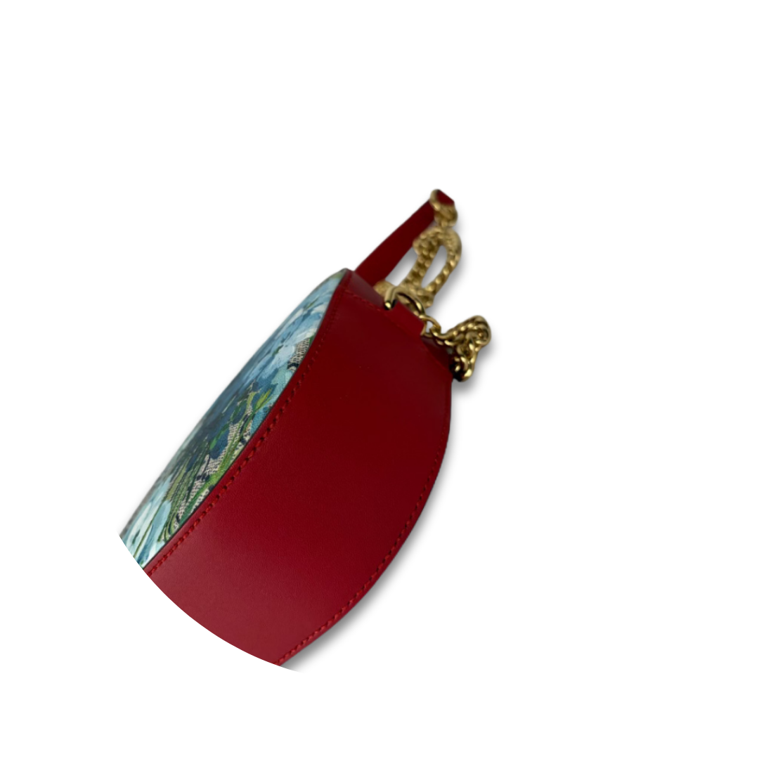 GG Supreme coated canvas exterior with red leather trim and interior, and antique gold-tone hardware. Features blue floral pattern, chain strap with shoulder gaurd, zipper closure, and interior pocket. Includes certificate of authenticity.