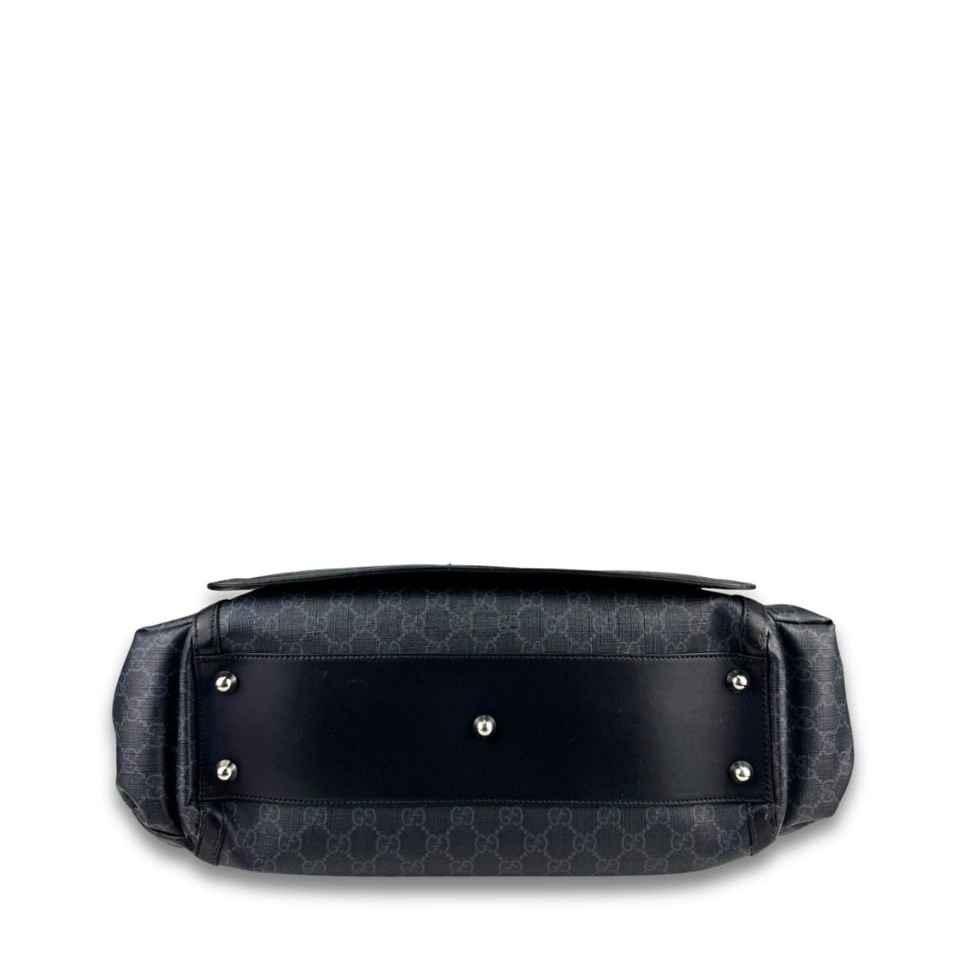 Black GG Supreme coated canvas exterior with black leather trim, black nylon interior, and silver-tone hardware. Features flap closure, adjustable navy and red web strap, back and side pockets with magnetic closure, two interior bottle holders, and three elastic open pockets. Please note corner wear as pictured. Includes certificate of authenticity.