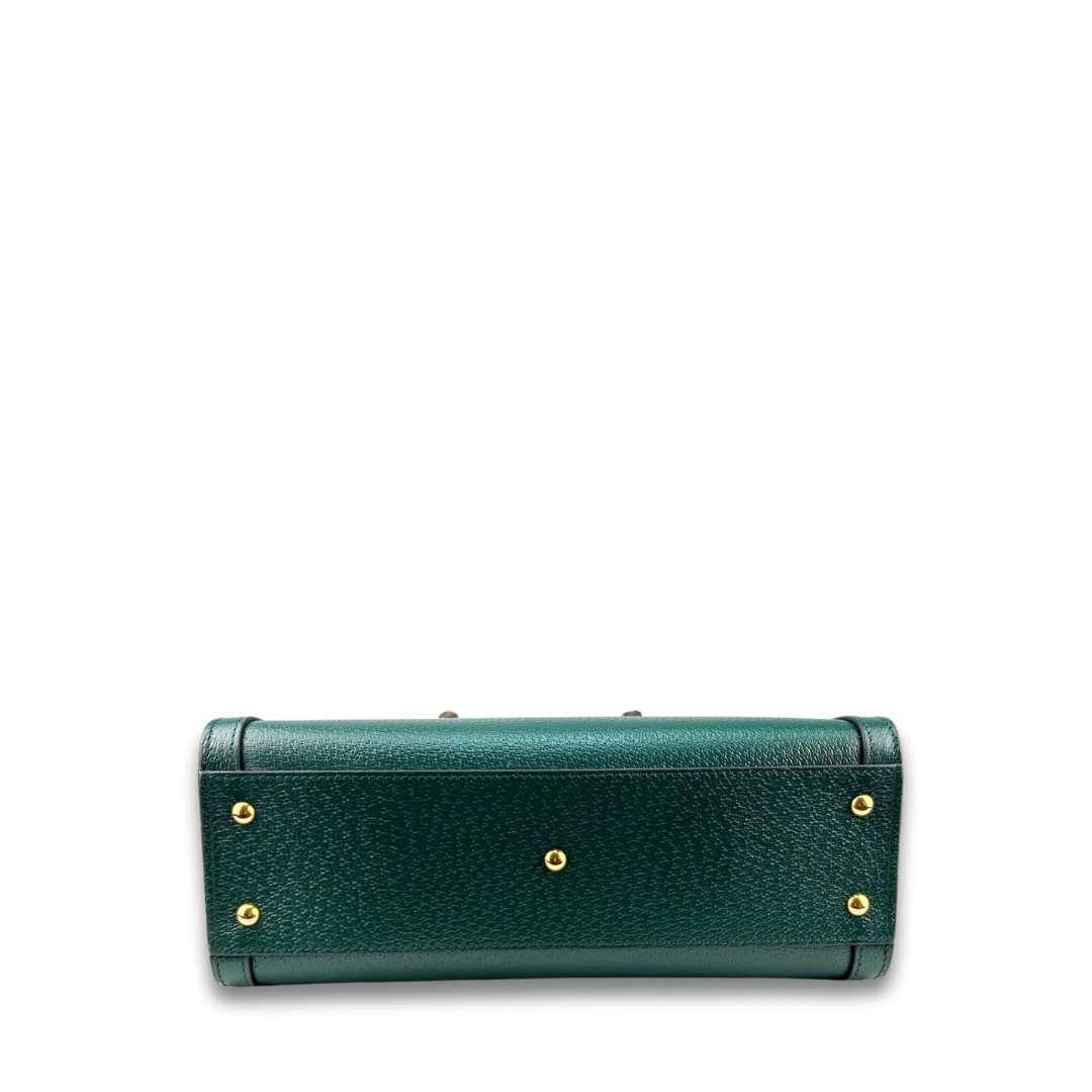 Dark green calfskin exterior with beige microfiber interior, gold-tone hardware, and pale pink leather trim. Features bamboo top handles, detachable navy and red webbing adjustable shoulder strap, detachable green leather shoulder strap, snap closure, and interior pockets. Includes certificate of authenticity.