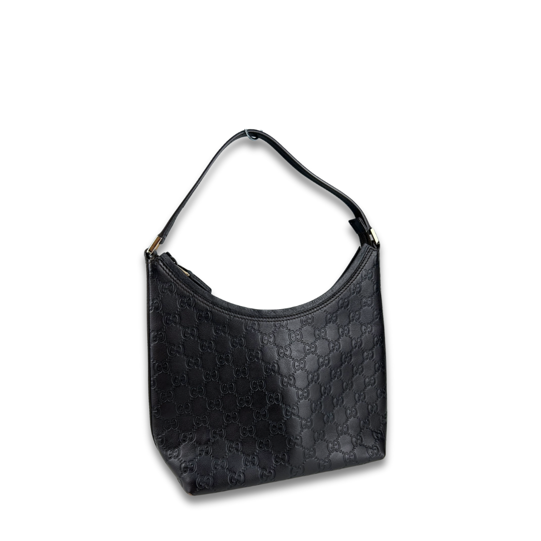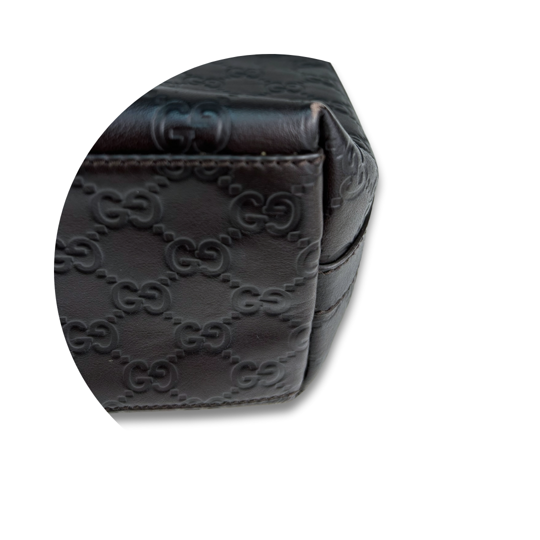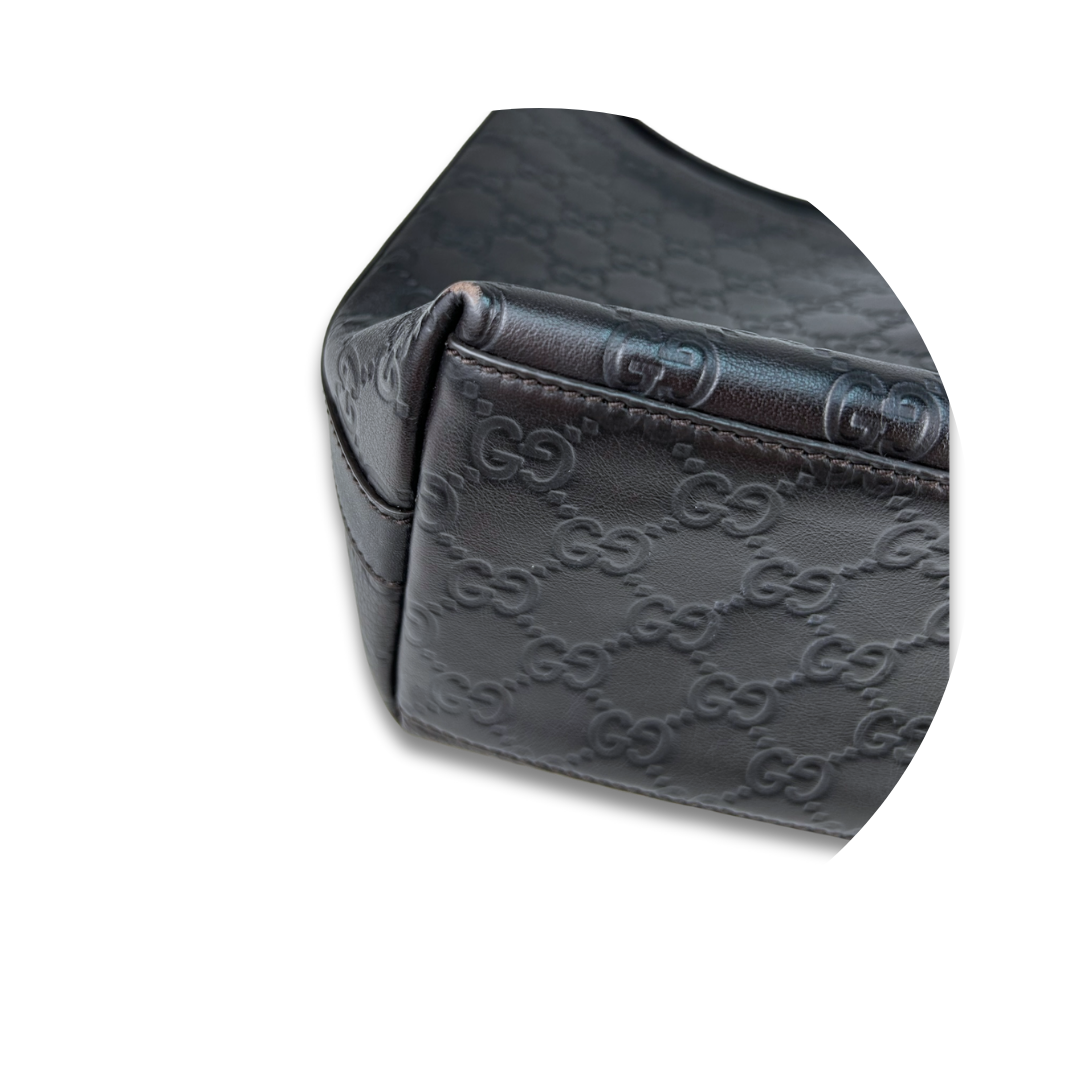 Black GG embossed leather exterior with black fabric interior and silver-tone hardware. Features slim leather top handle, zipper closure, and interior zipper pocket. Includes certificate of authenticity.