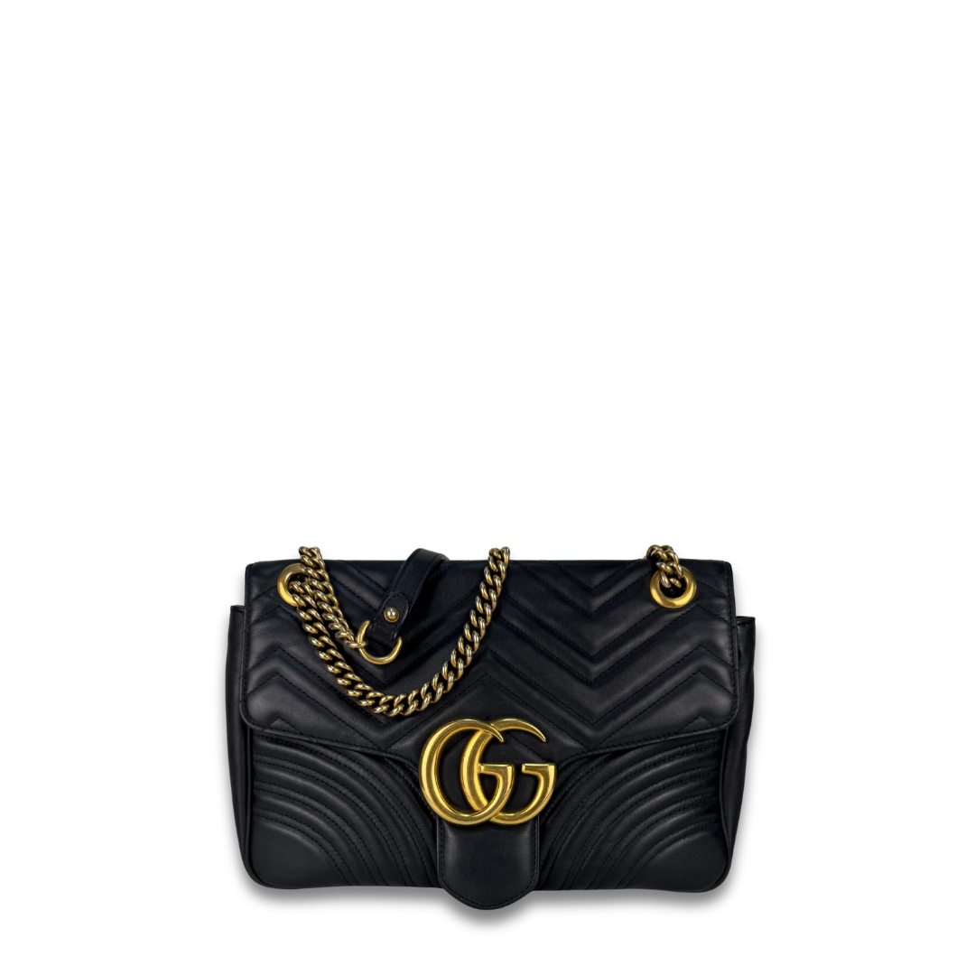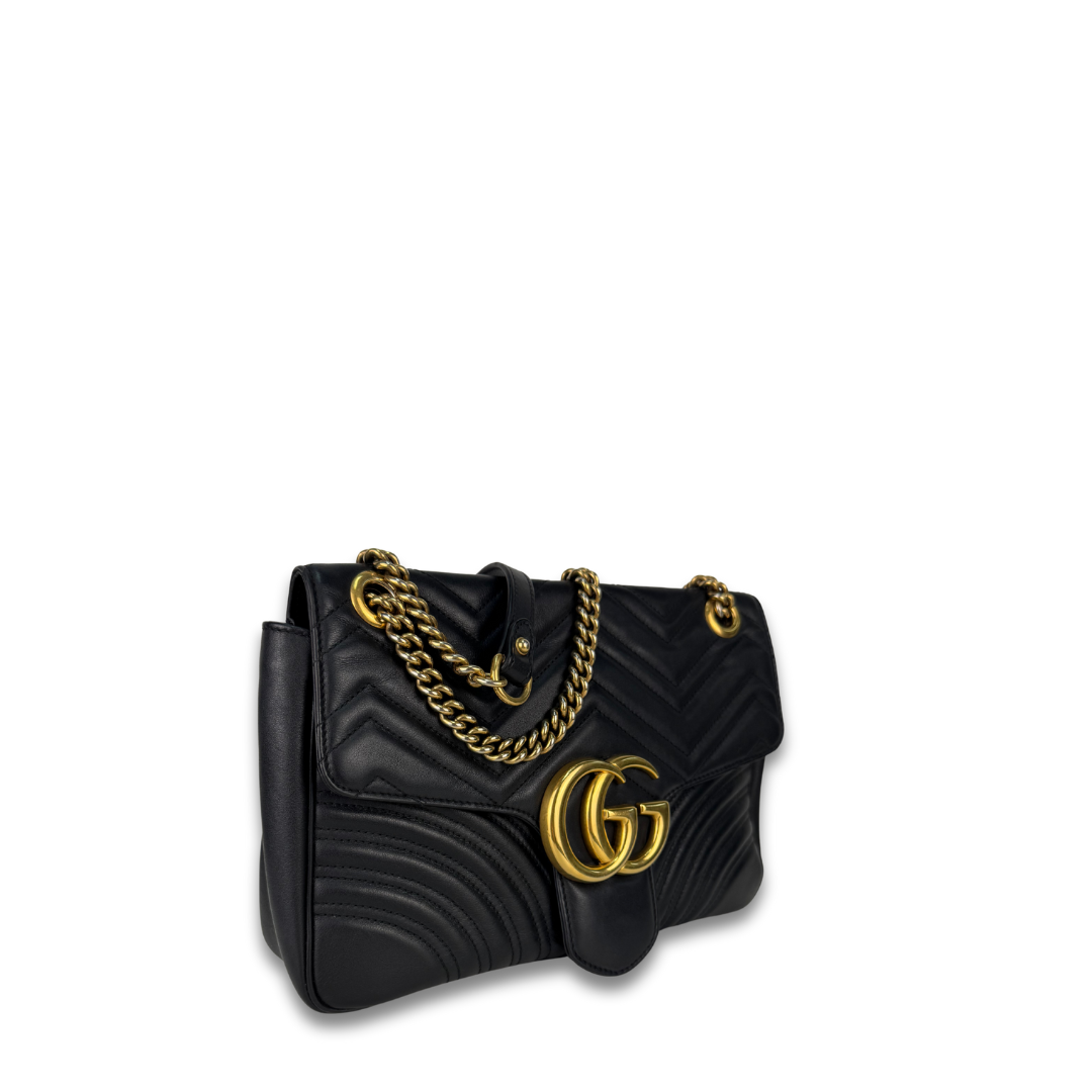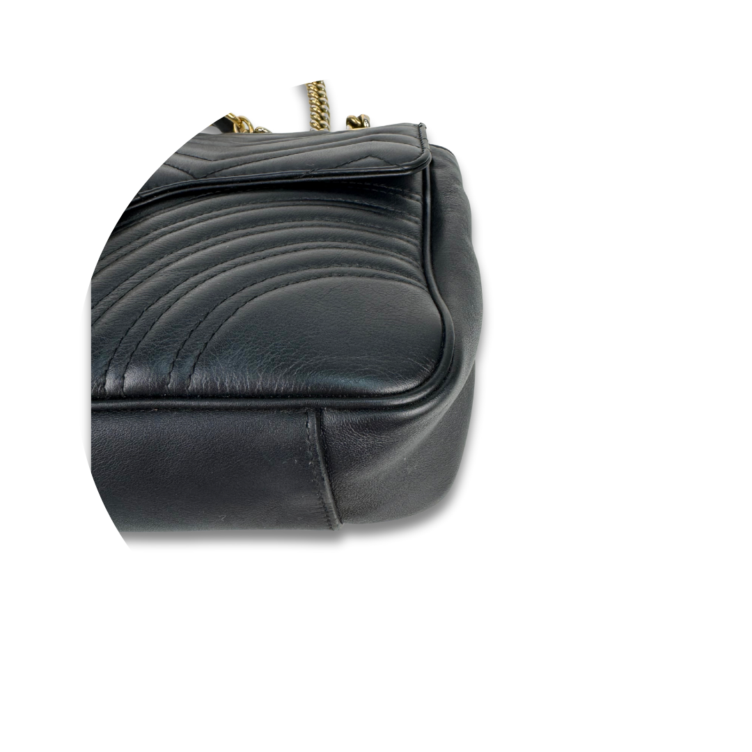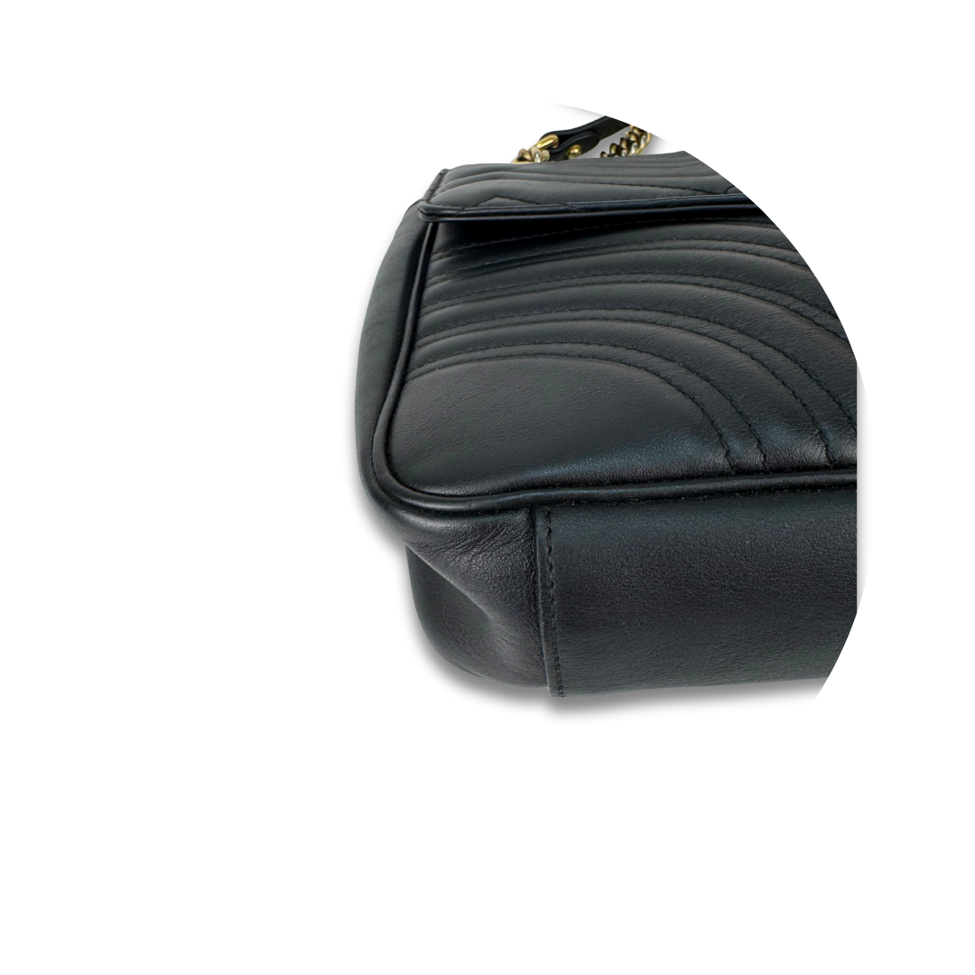 Black chevron leather exterior, beige microfiber interior, and aged gold-tone hardware. Features GG Marmont logo at front, flap with spring closure, chain shoulder strap with leather shoulder guard, and interior pocket. Includes certificate of authenticity and original dust bag.