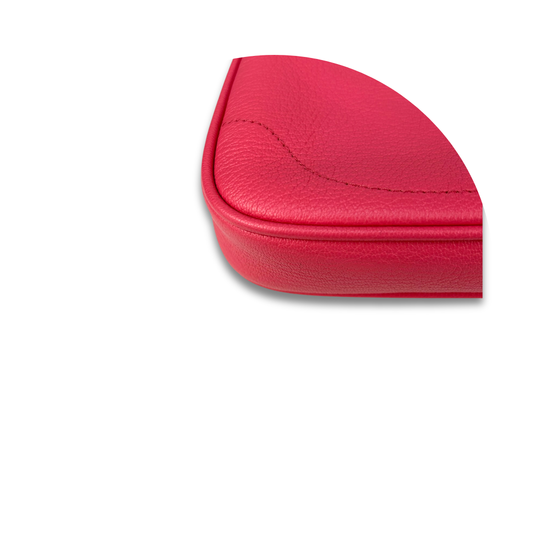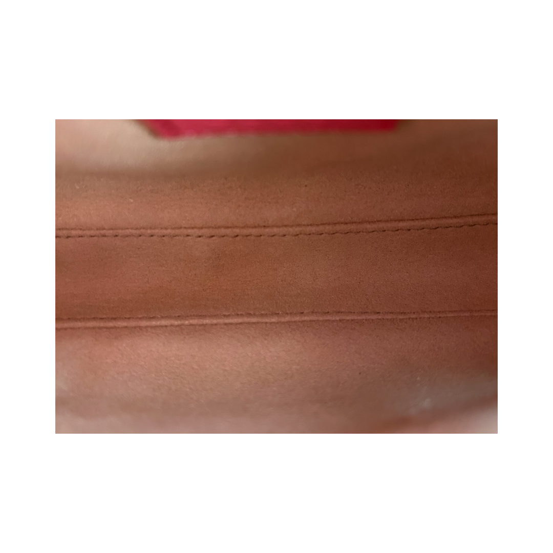 Pink leather exterior with beige microfiber interior and brushed gold-tone hardware. Features zipper closure and adjustable strap. Includes certificate of authenticity and original dust bag.