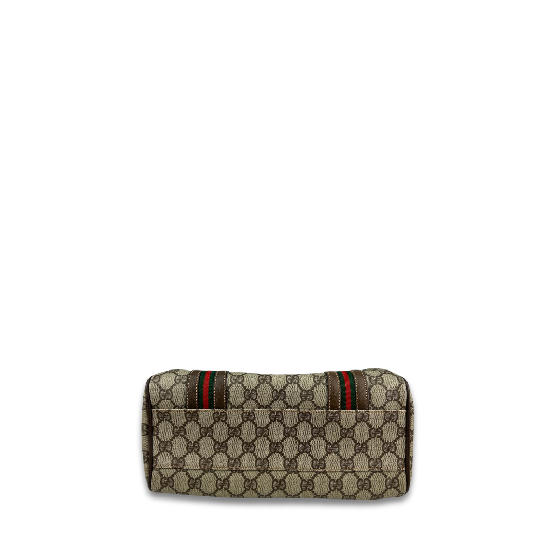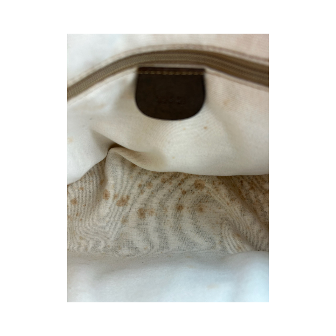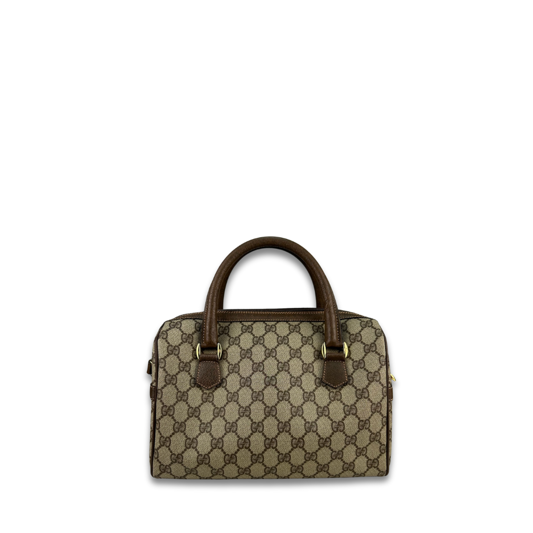 Brown and beige GG Supreme coated canvas exterior, beige fabric interior, and gold-tone hardware. Features dual rolled leather top handles, detachable and adjustable leather shoulder strap, zipper closure, and interior pocket. Please note, interior spotting as pictured. Includes certificate of authenticity.