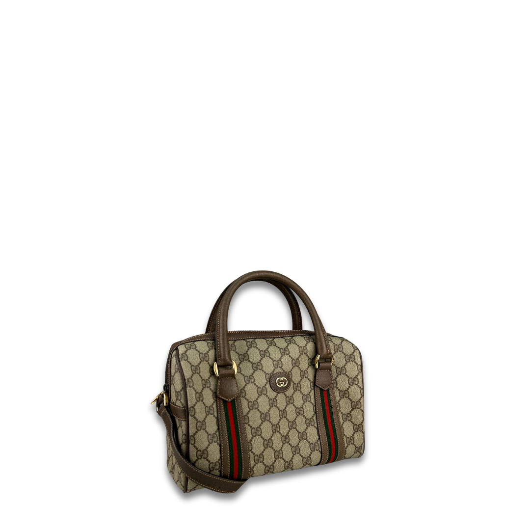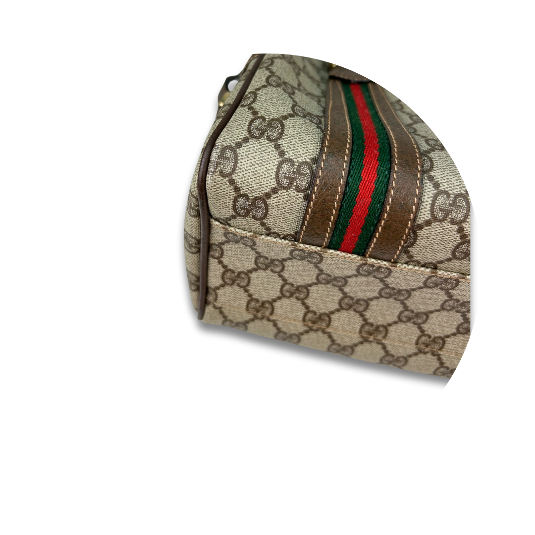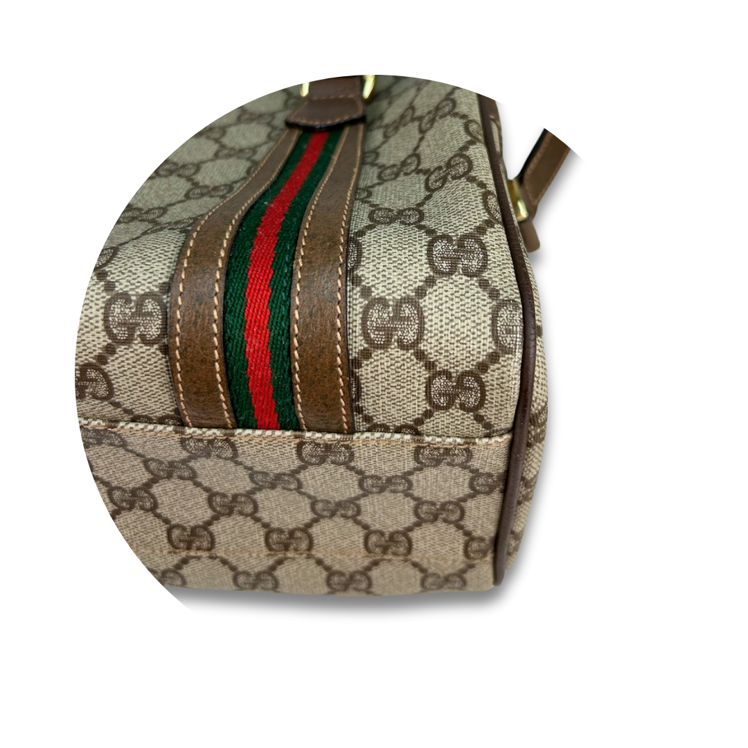 Brown and beige GG Supreme coated canvas exterior, beige fabric interior, and gold-tone hardware. Features dual rolled leather top handles, detachable and adjustable leather shoulder strap, zipper closure, and interior pocket. Please note, interior spotting as pictured. Includes certificate of authenticity.