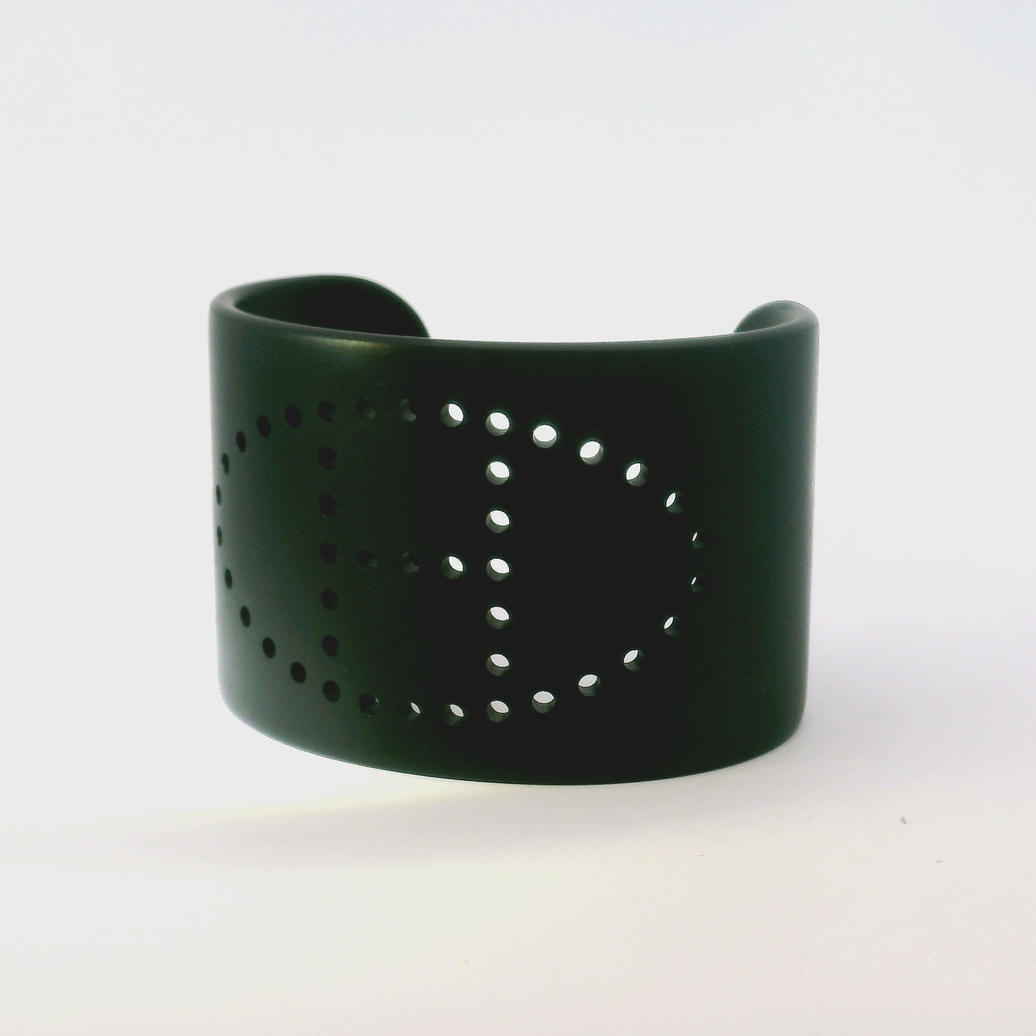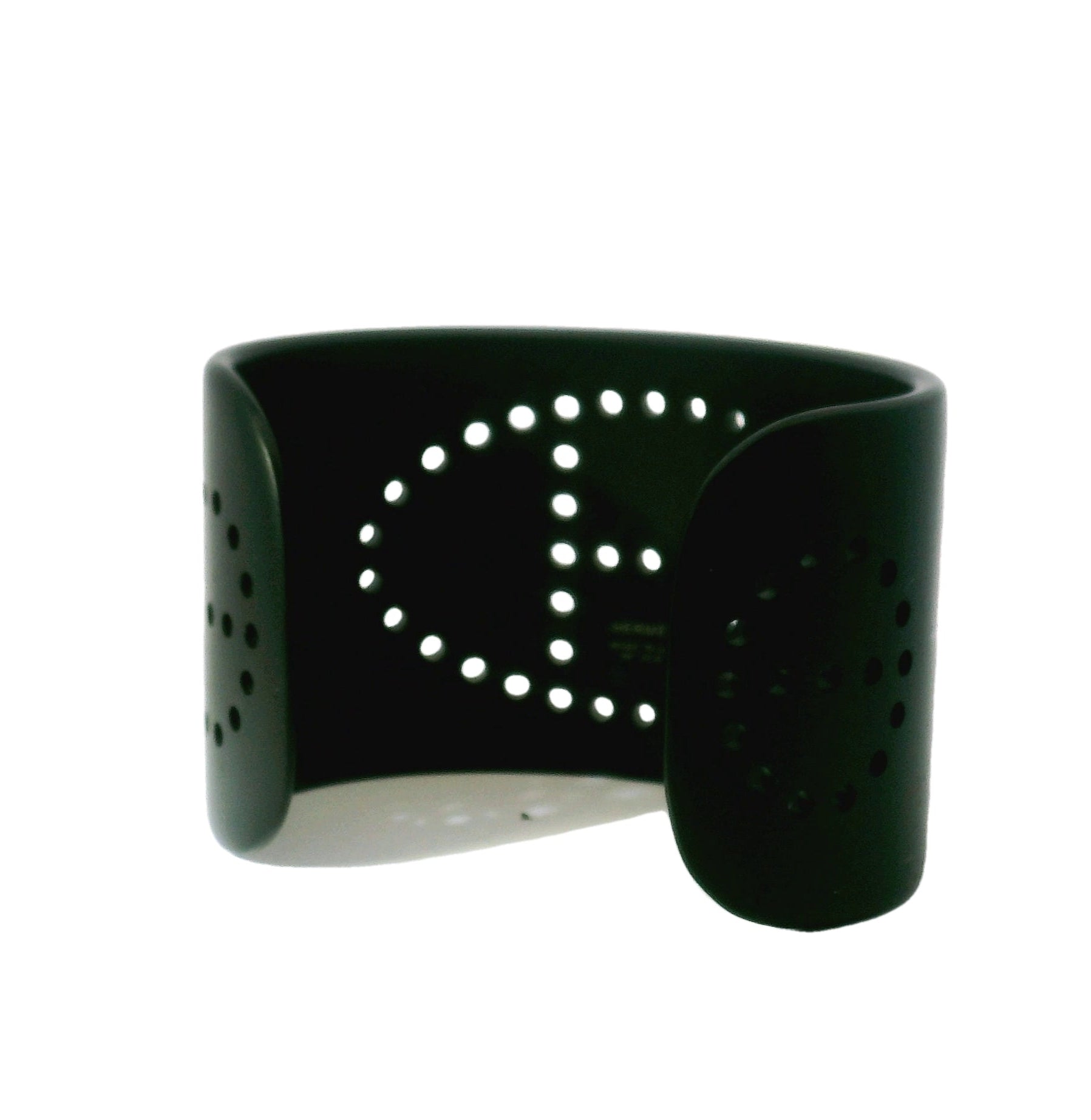 Matte Black Aluminum cuff bracelet. Features Evelyne punching logo. Faint shallow scratch on front. Includes certificate of authenticity.
