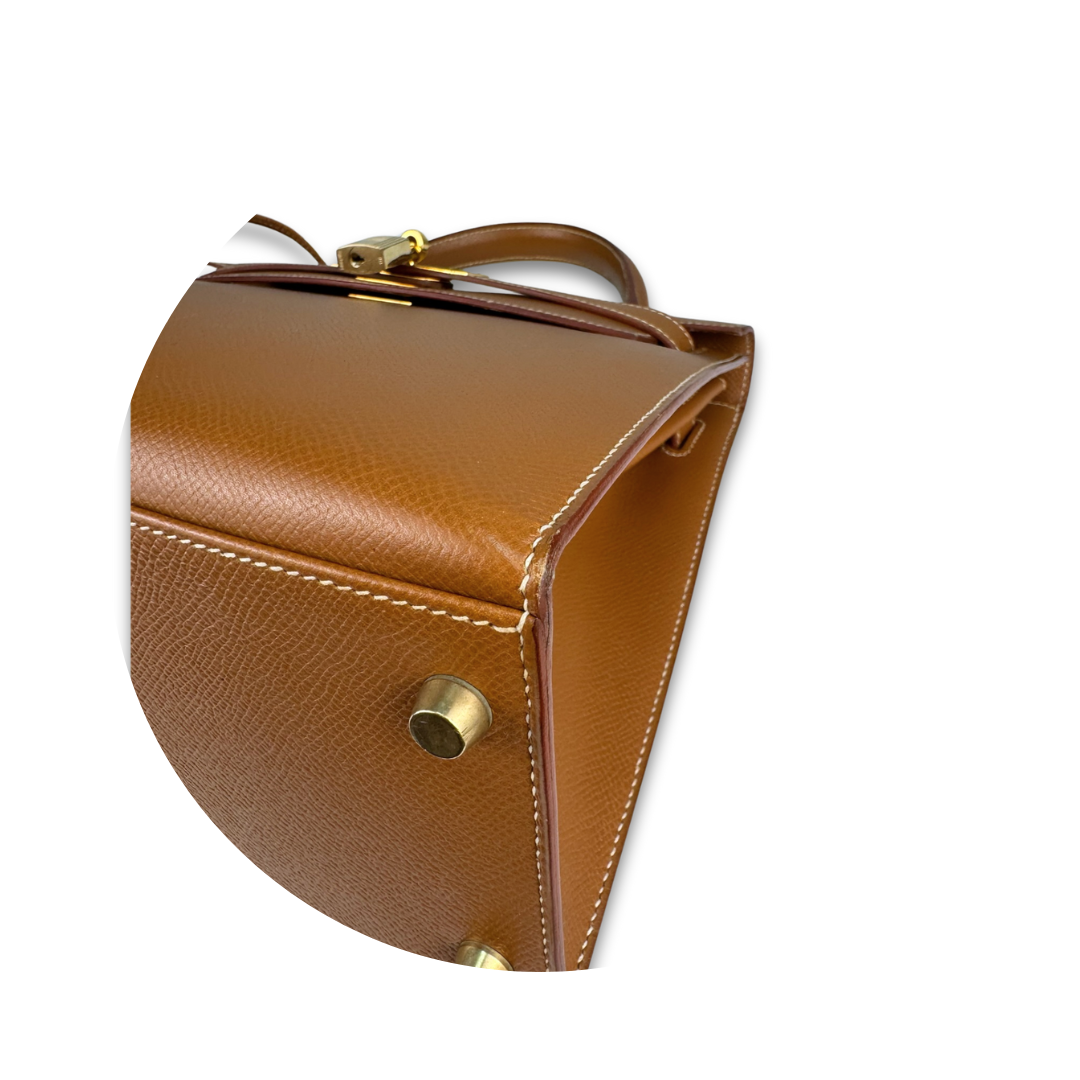 Gold Epsom leather exterior with tonal leather interior and gold-plated hardware. Features single rolled top handle, exterior lock, detachable shoulder strap, and 3 interior pockets. Please note, minor corner wear and scratch to leather as pictured. Includes original dust bag and certificate of authenticity.