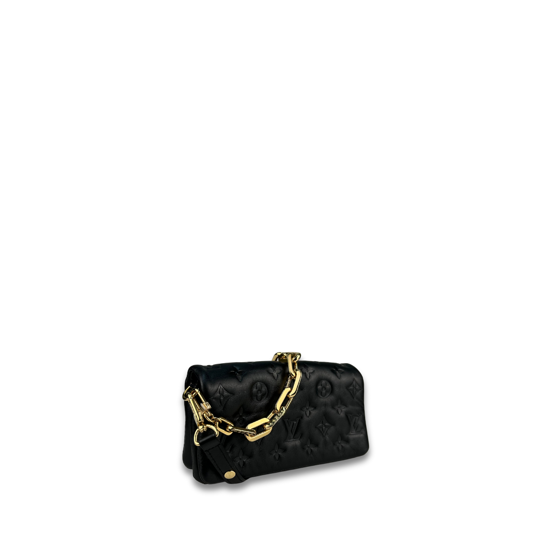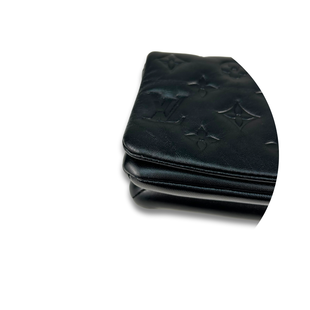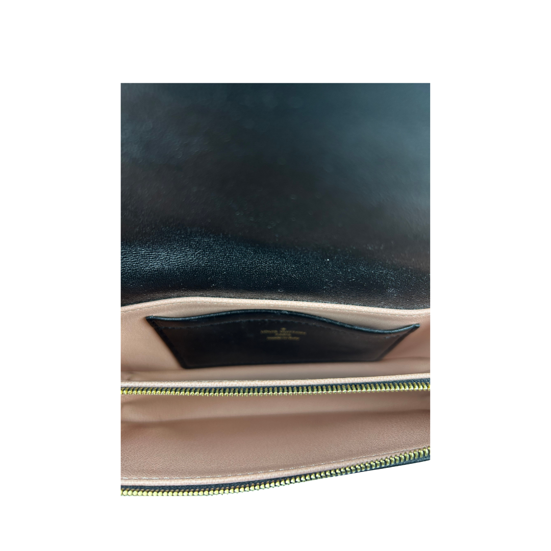 Black lambskin exterior embossed with LV Monogram pattern, pink leather interior, and gold-tone hardware. Features flap with magnetic snap closure that opens to interior zipper compartment and an open compartment, interior flat pocket, detachable and adjustable leather strap, and detachable gold-tone chain-link strap. Includes certificate of authenticity, original dust bag, and box.