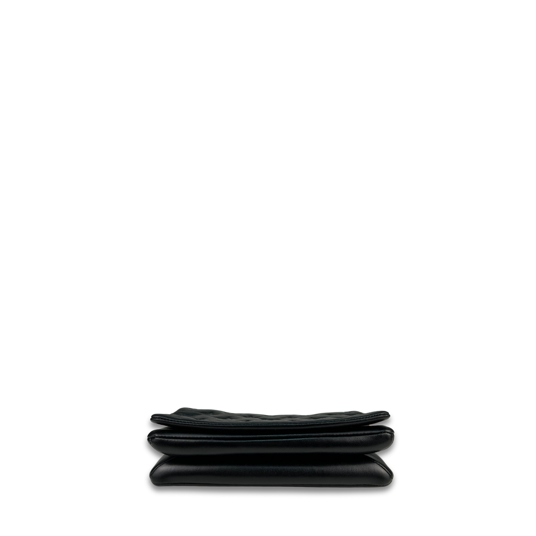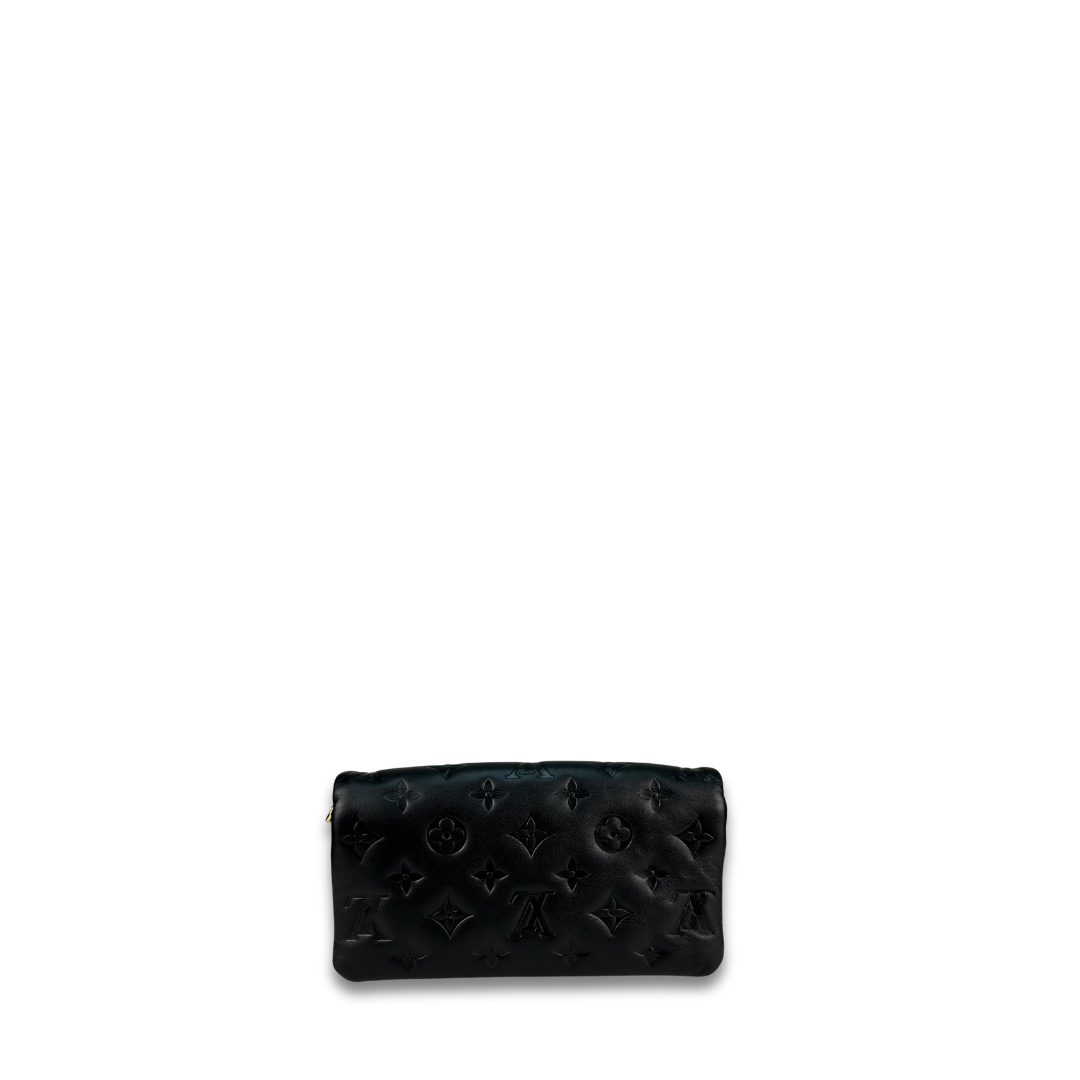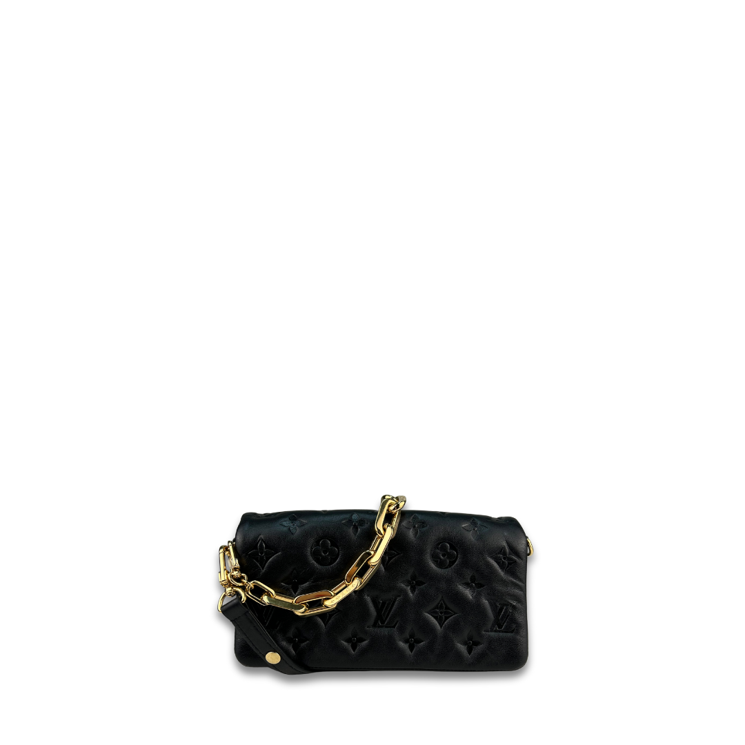 Black lambskin exterior embossed with LV Monogram pattern, pink leather interior, and gold-tone hardware. Features flap with magnetic snap closure that opens to interior zipper compartment and an open compartment, interior flat pocket, detachable and adjustable leather strap, and detachable gold-tone chain-link strap. Includes certificate of authenticity, original dust bag, and box.