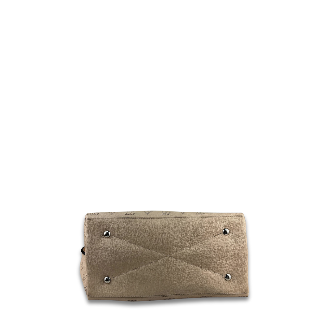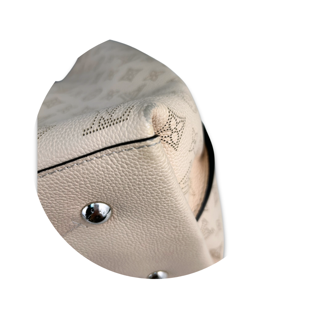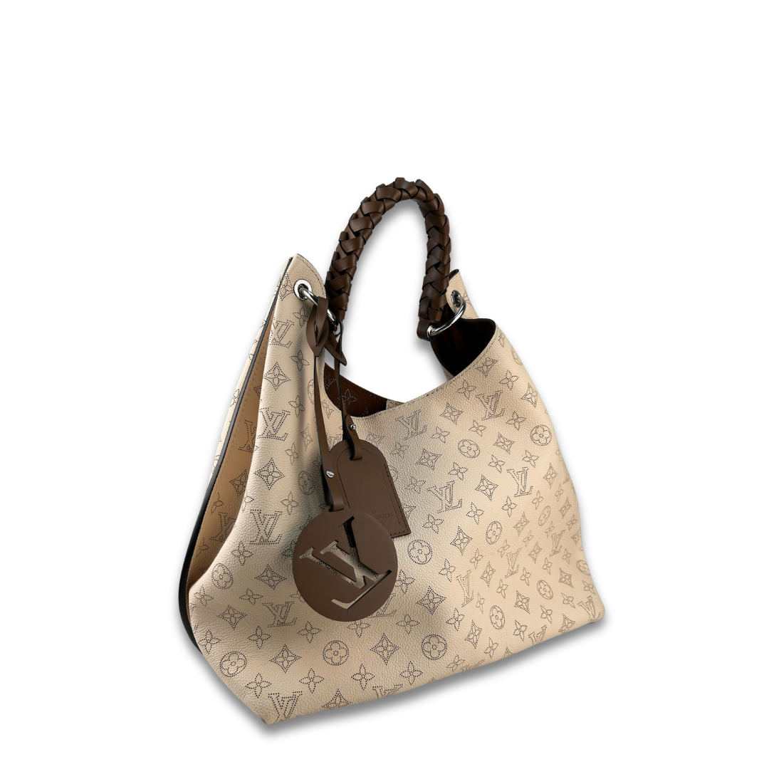 Beige mahina leather exterior, brown microfiber interior, and silver hardware. Features a braided leather top handle, removable bag charm and luggage tag, open top with snap closure, and an interior zipper pocket. Includes certificate of authenticity and original dust bag.