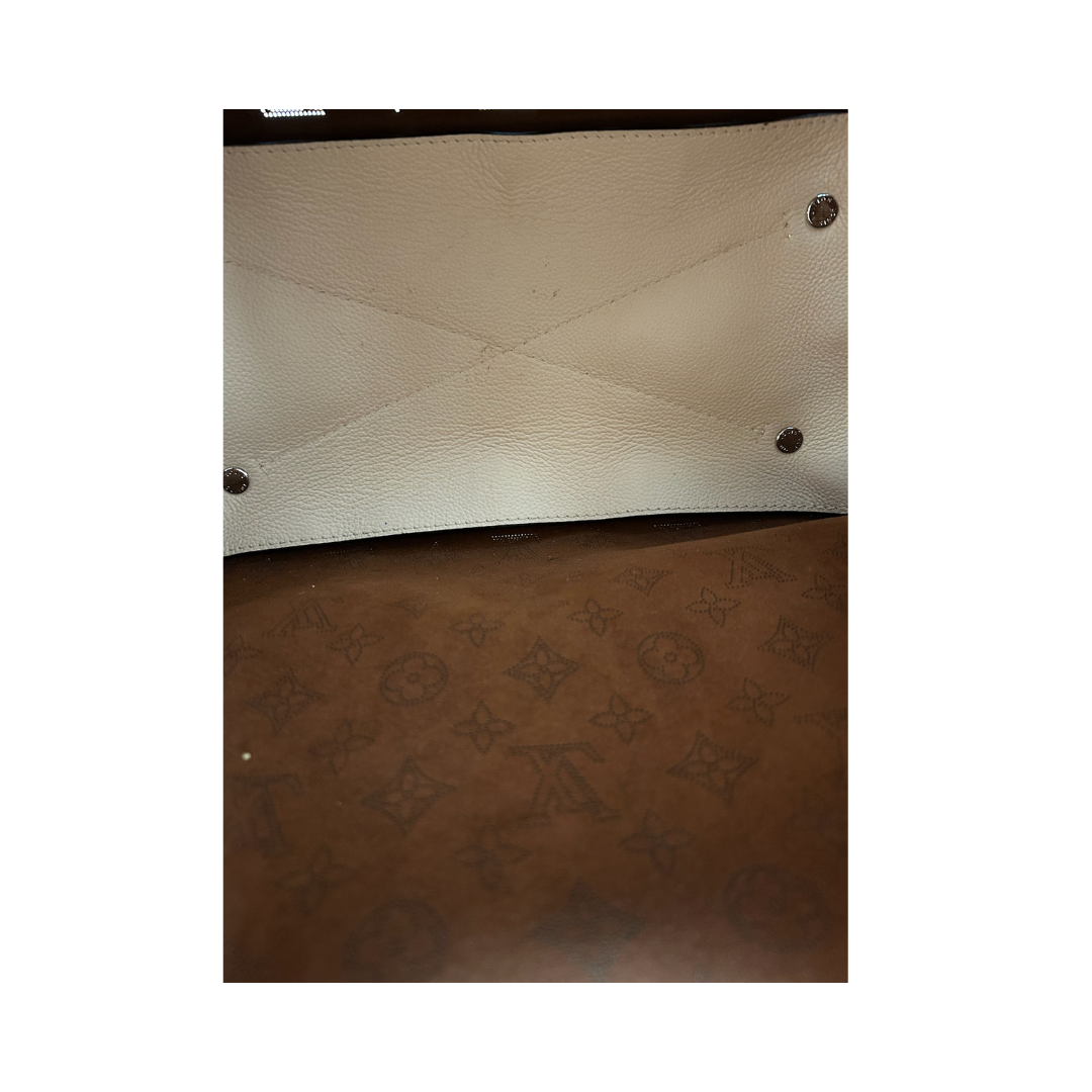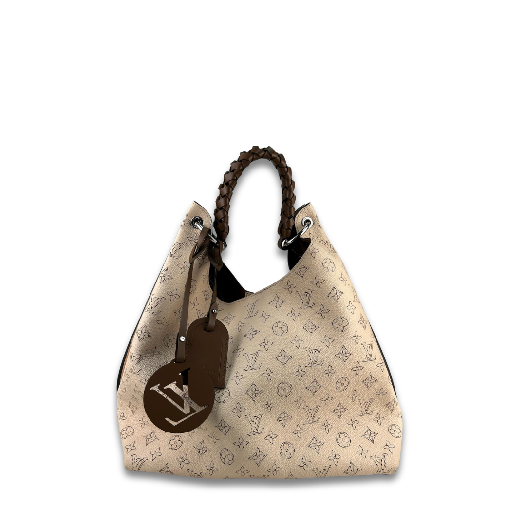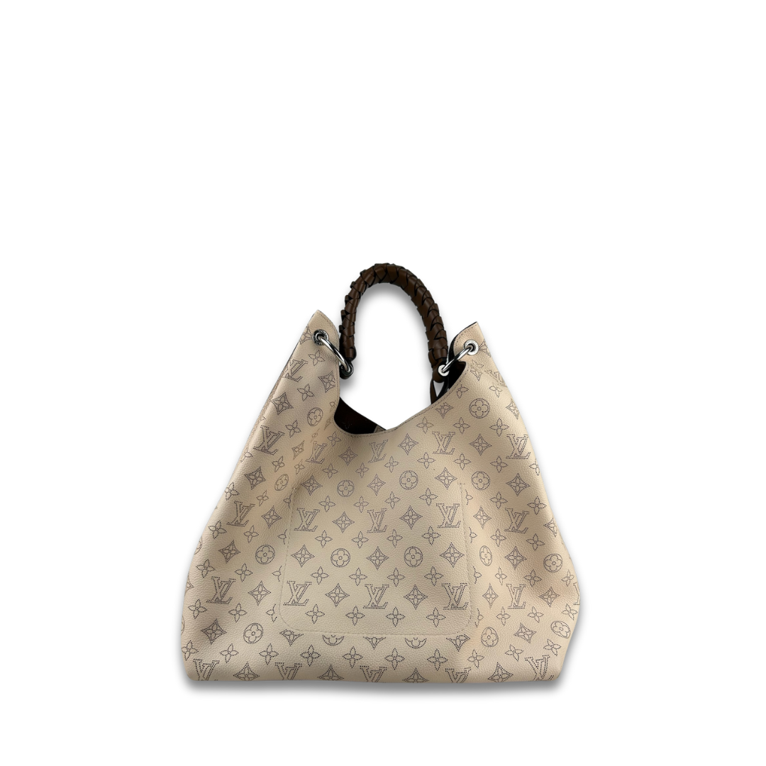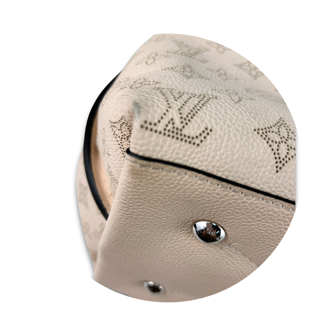 Beige mahina leather exterior, brown microfiber interior, and silver hardware. Features a braided leather top handle, removable bag charm and luggage tag, open top with snap closure, and an interior zipper pocket. Includes certificate of authenticity and original dust bag.