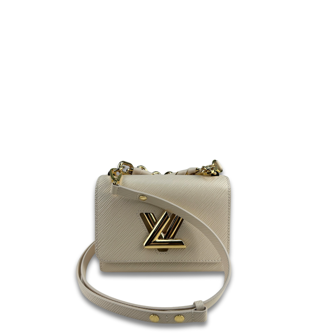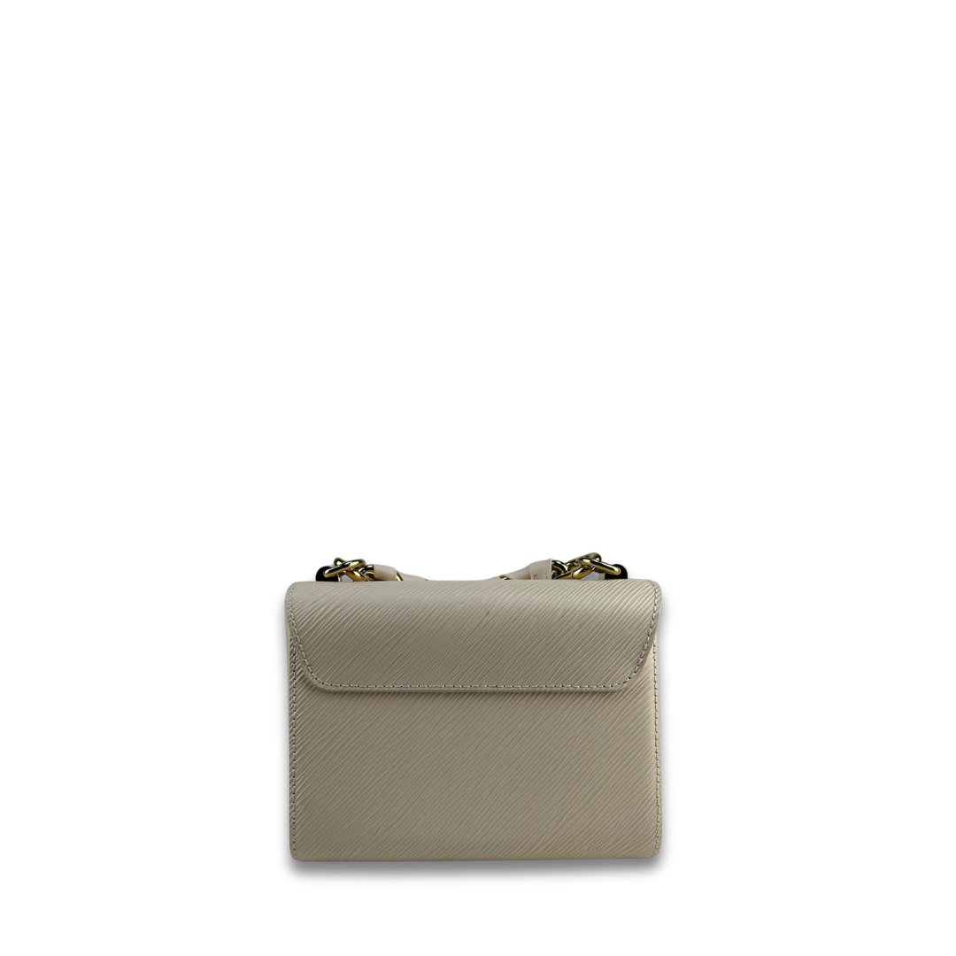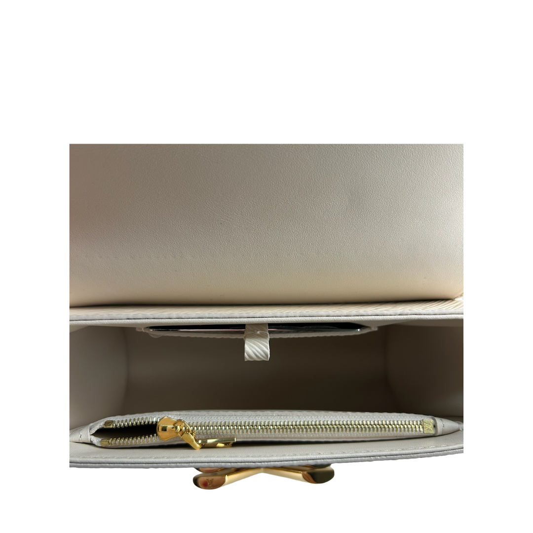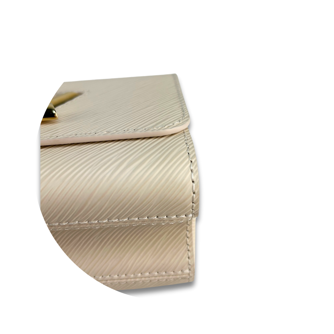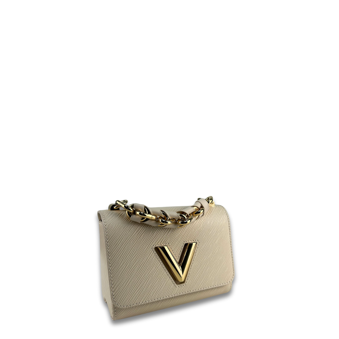Beige epi leather exterior with tonal leather interior and gold-tone hardware. Features a detachable leather and chain woven top handle, detachable and adjustable leather strap, LV twist closure, interior zipper pocket, and interior flat pocket. Includes certificate of authenticity and original dust bag.