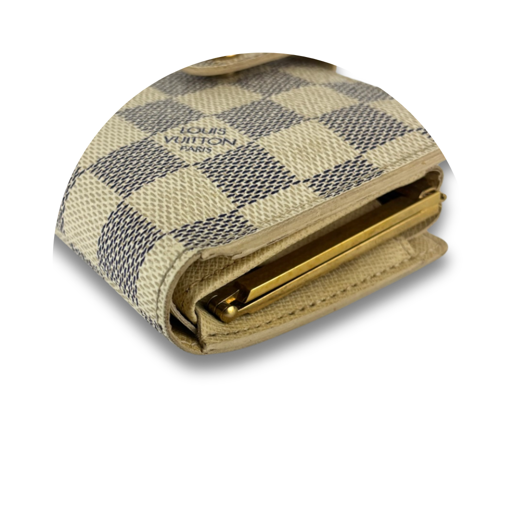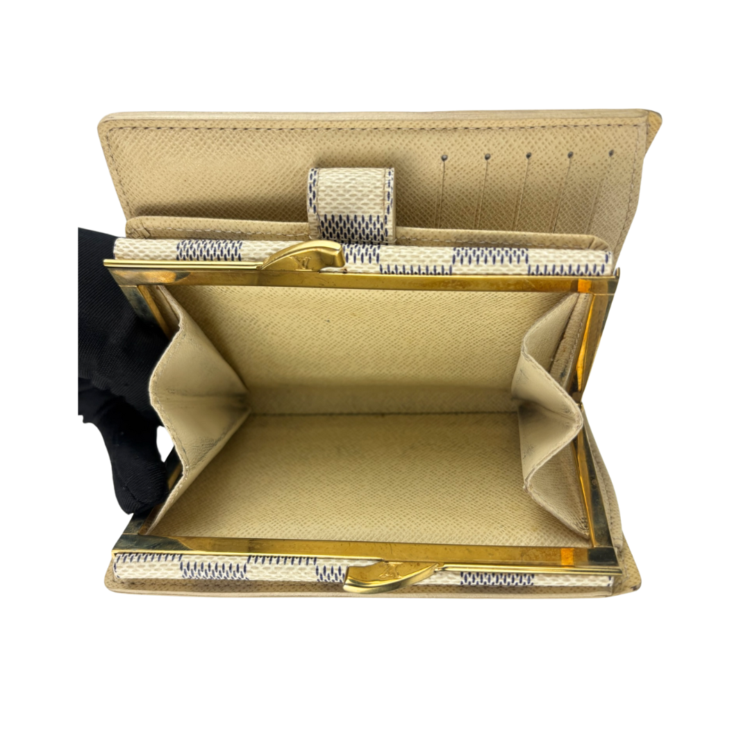 Classic LV Damier Azur coated canvas exterior with cream crossgrain leather interior and gold-tone hardware. Features a snap closure that opens to 4 card slots, 2 patch pockets, and 1 bill compartment, an additional kiss-lock closure, and a coin purse. Includes certificate of authenticity.